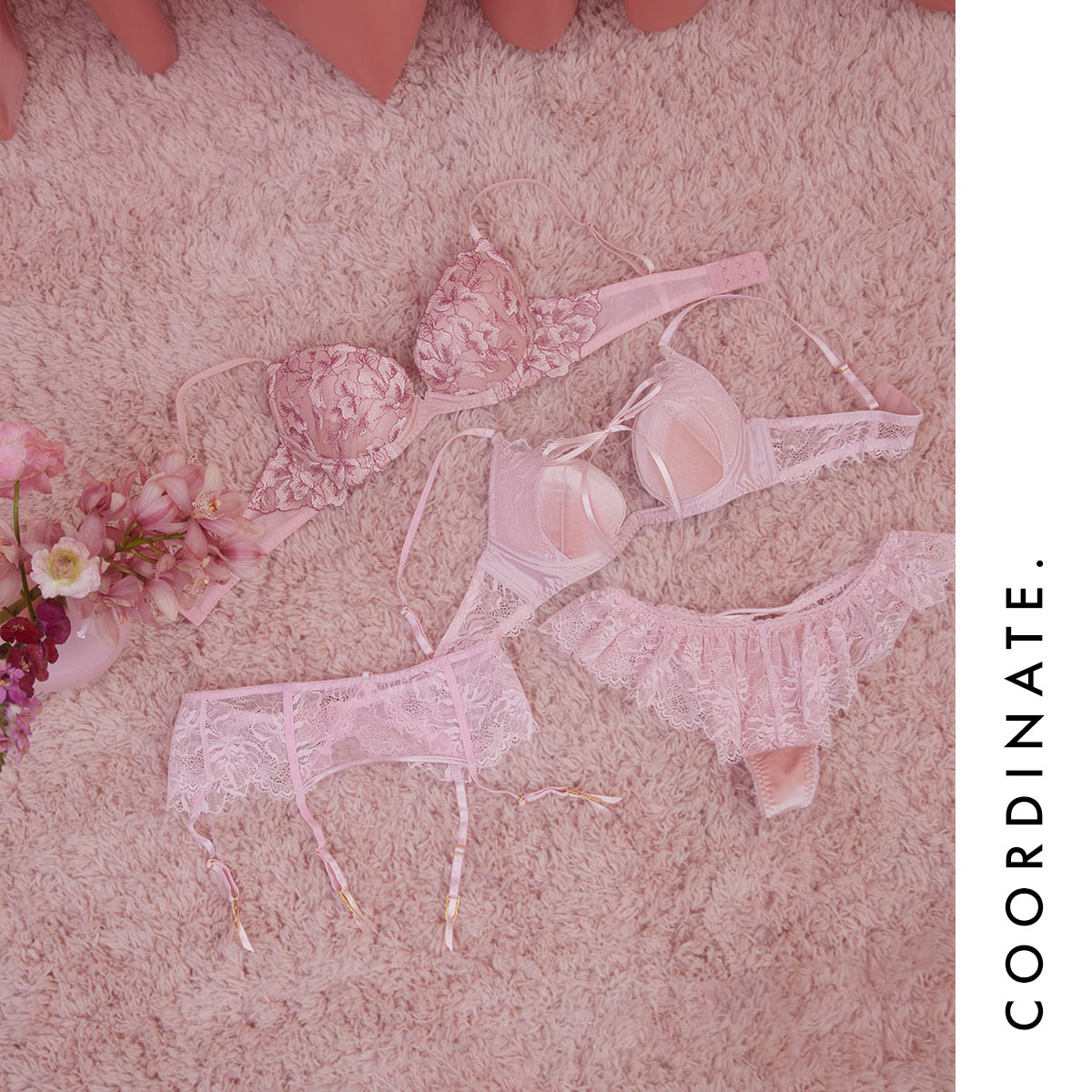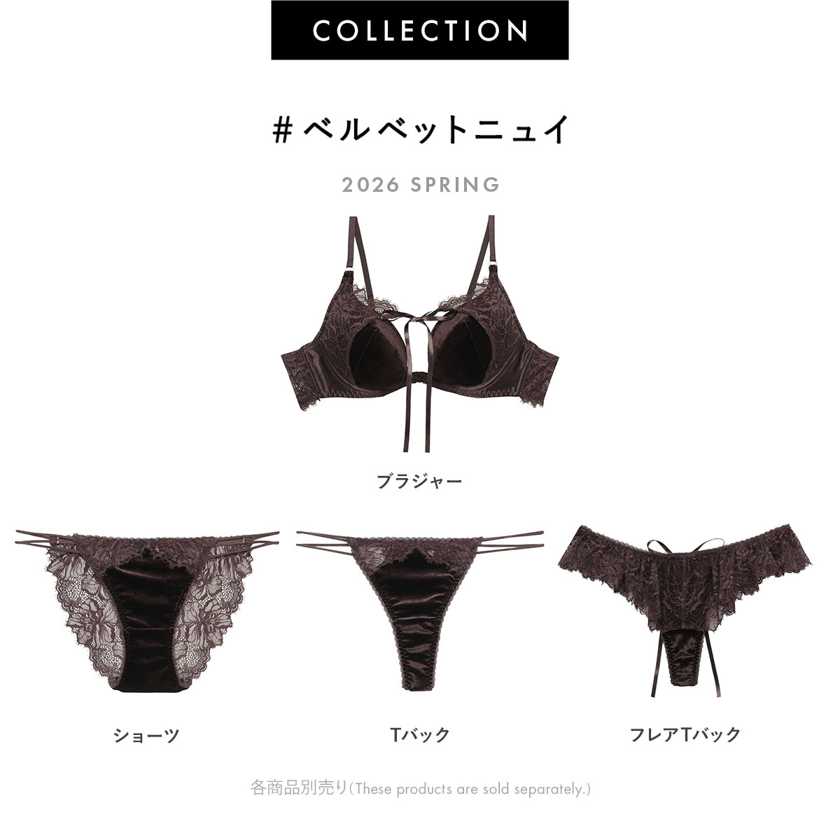 上品で滑らかなベルベット調のカップに、繊細なアイラッシュレースが軽やかな透け感を与える【ベルベットニュイ】。ロマンティックで優しいピンクとチョコレートのように甘いブラウンの2色展開。自分をプレゼントのように演出できる、このシーズンならではの特別なコレクションです。
