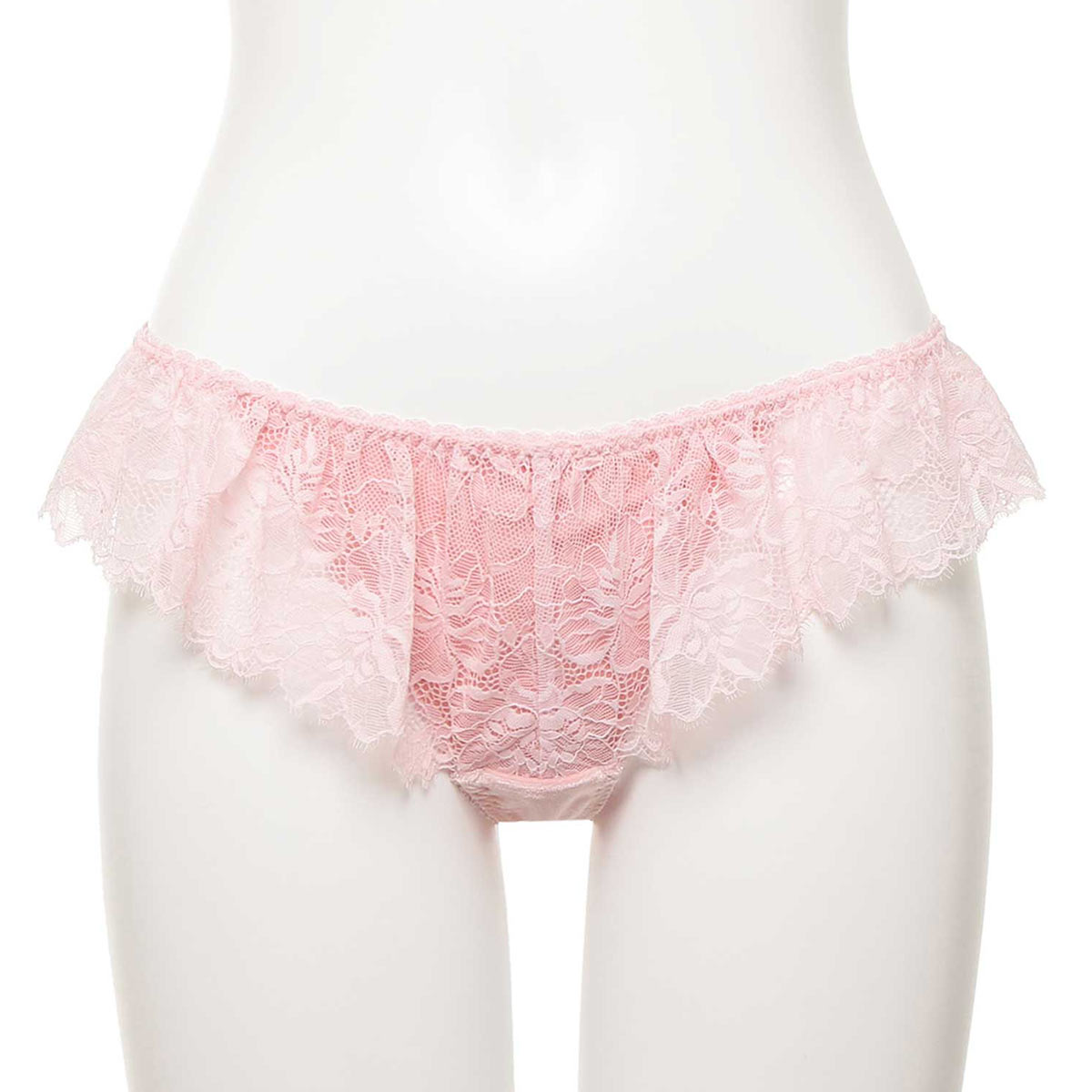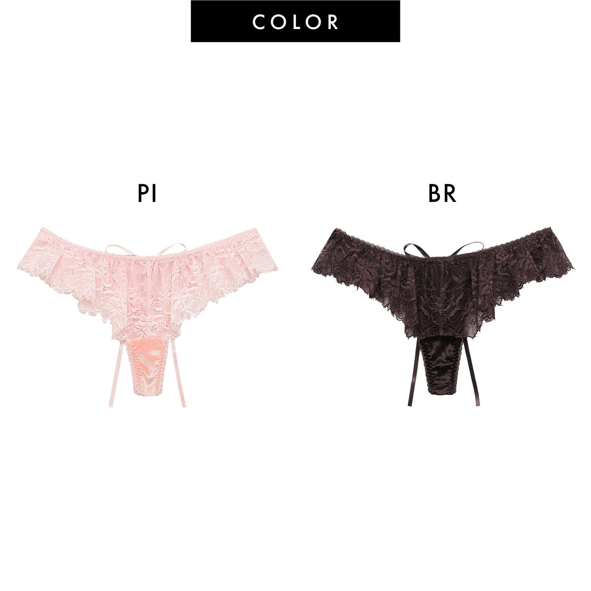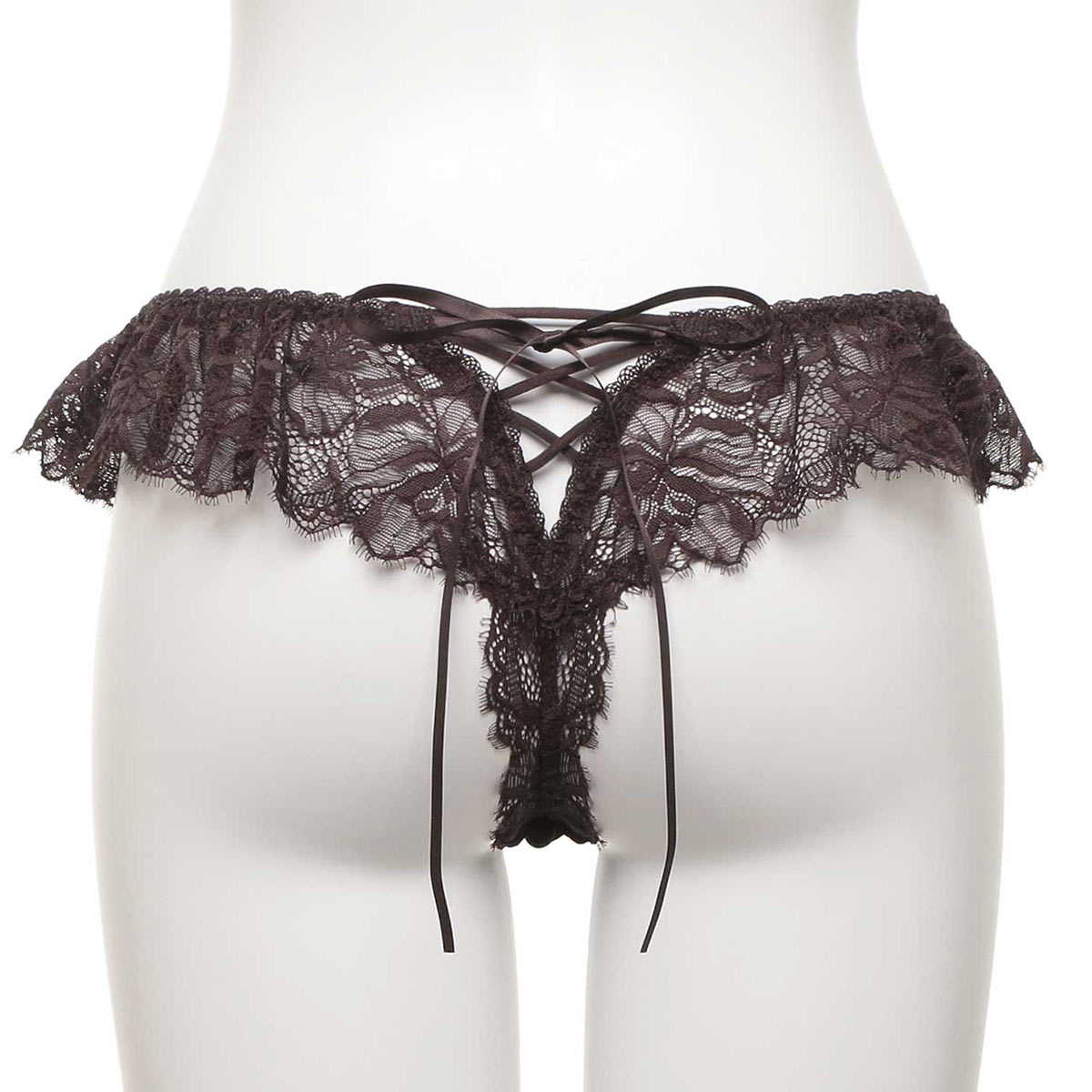 アイラッシュレースのフリルが甘さを抑えた大人の魅力を演出するTバックショーツ。ヒップはマカロニコードをクロスし、手結び仕様のリボンが動くたびに視線を惹きつけるデザインです。
