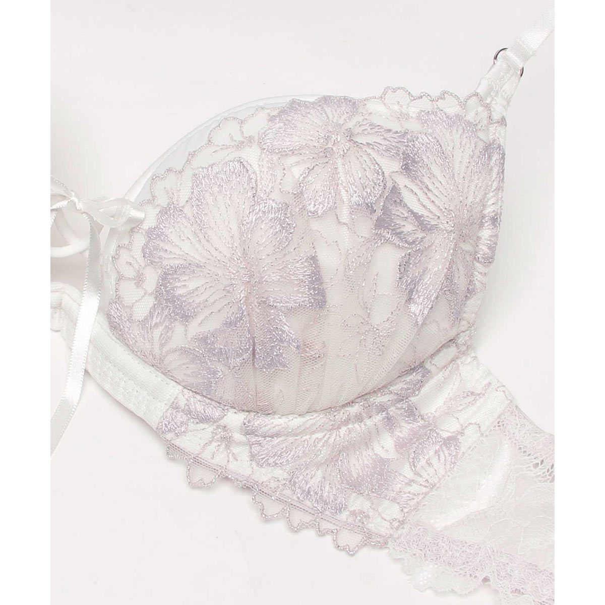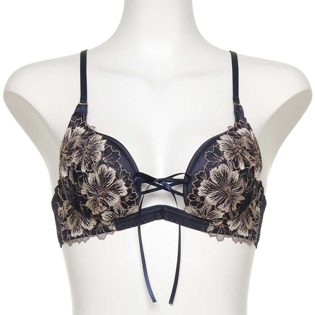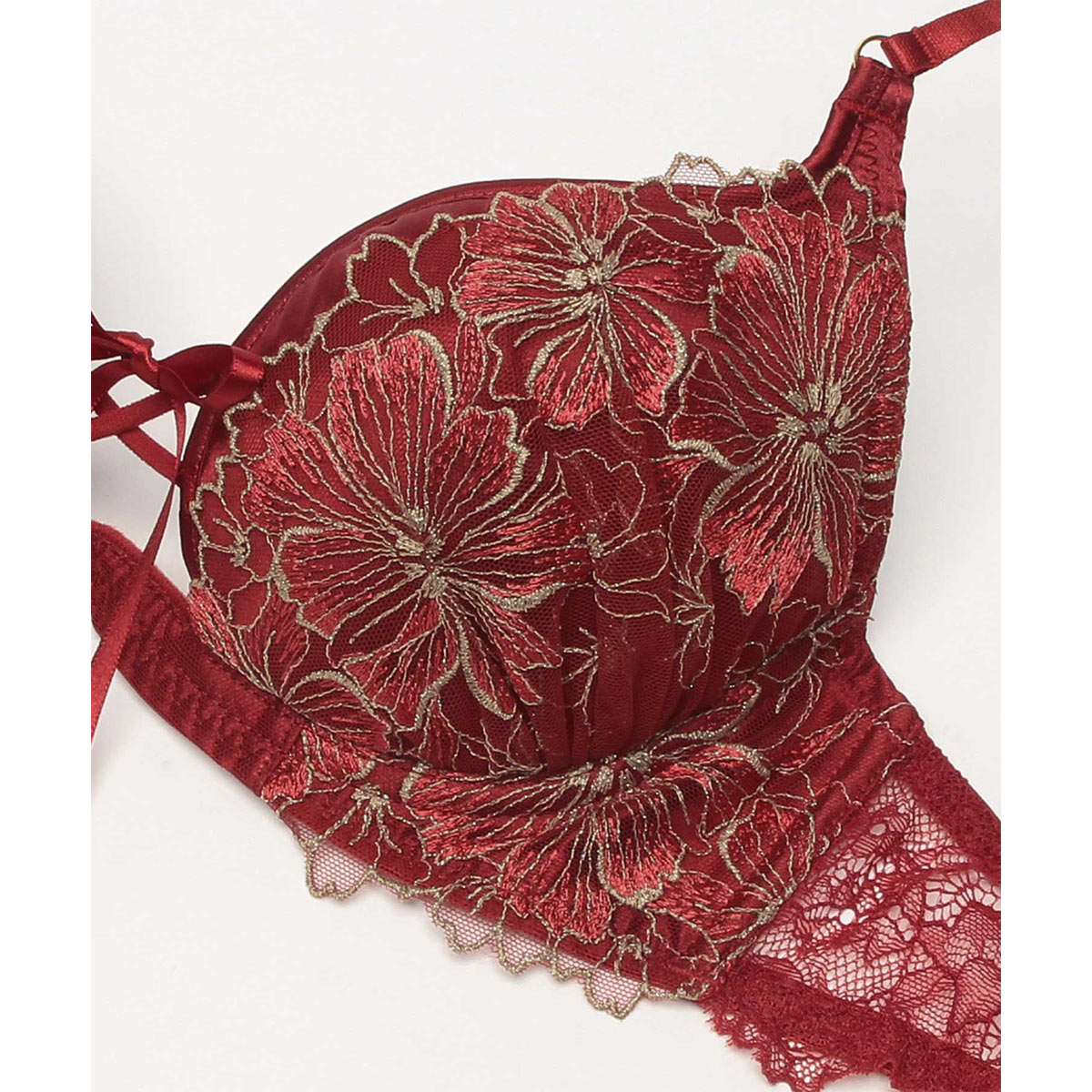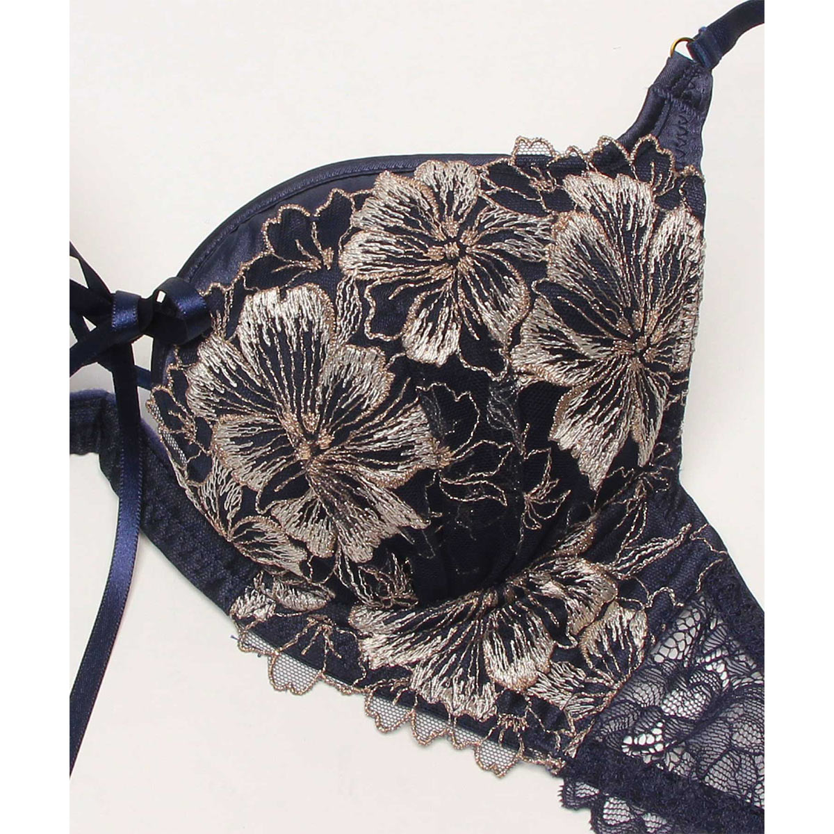 優雅な気品と可憐な艶で魅せるコレクション【アルミラ】。洗練された大人の魅力を引き出します。大輪のフラワーレースに大粒のラメが濡れたように輝き、胸元をドラマティックに演出。センターにはクロスコードとサテンリボンを添えました。サテンリボンは手結びできるので、フィット感を増し、深い谷間をメイクします。
