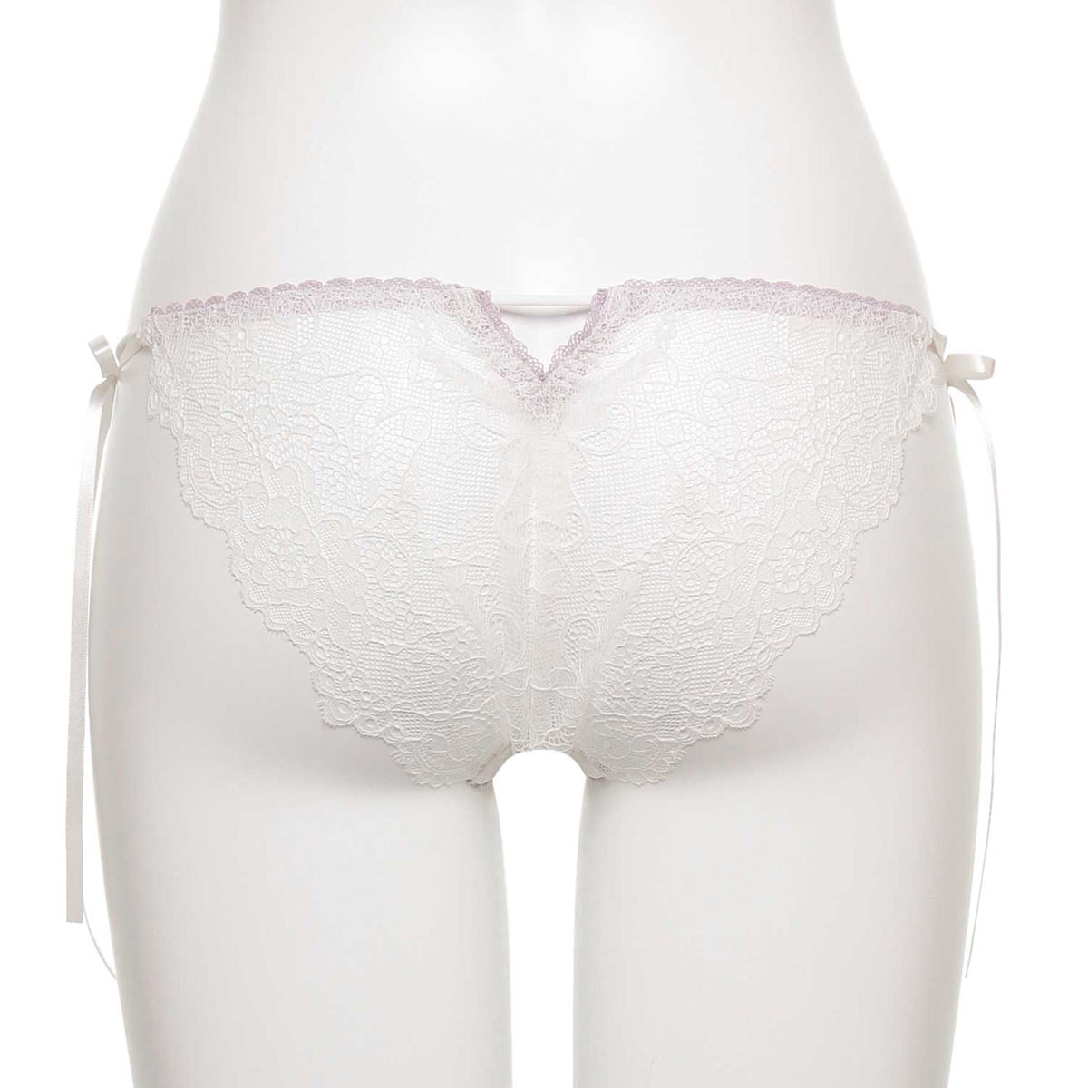 大輪の花が咲き溢れるエンブロイダリーレースを贅沢に使用したサイドリボンショーツ。リボンは手結びタイプですが、ストリングコードとのダブル使いで、解けても脱げない安心仕様。バックのトライアングホールにクロスしたコードがドラマティックなデザインです。