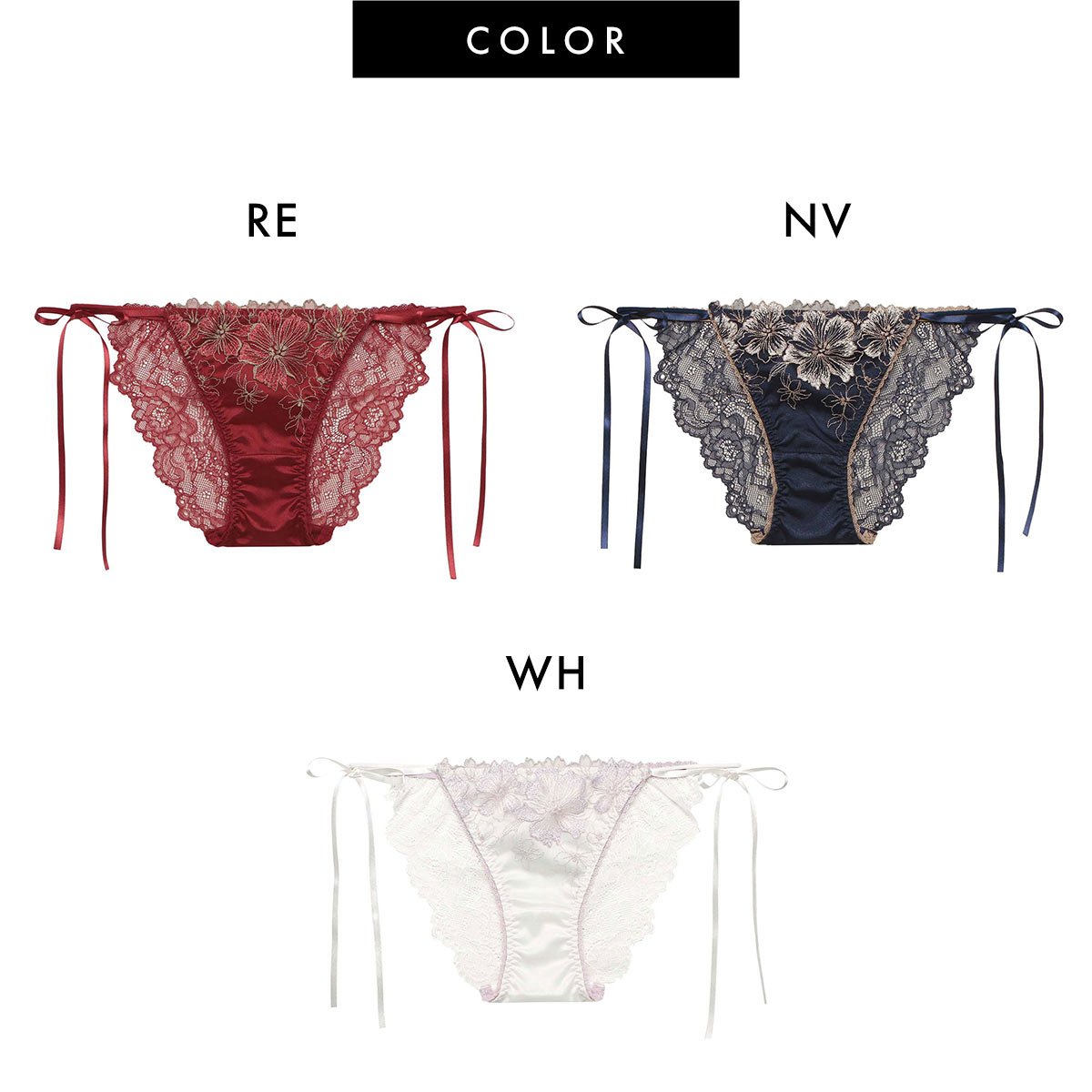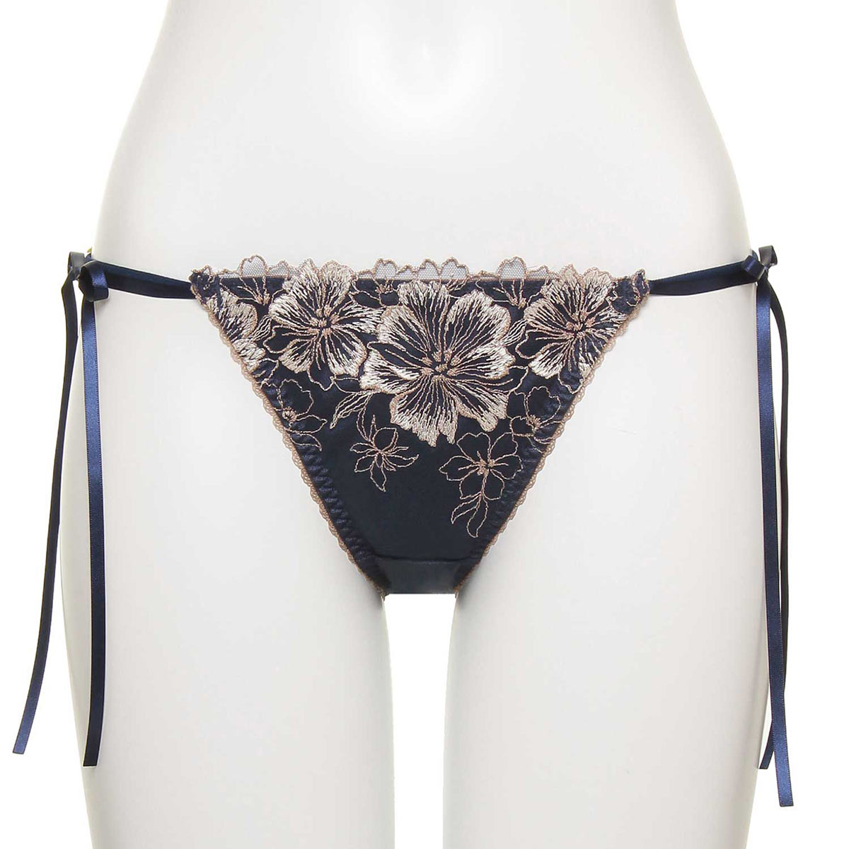 大輪の花が咲き溢れるエンブロイダリーレースを贅沢に使用したサイドリボンショーツ。リボンは手結びタイプですが、ストリングコードとのダブル使いで、解けても脱げない安心仕様。バックのトライアングホールにクロスしたコードがドラマティックなデザインです。