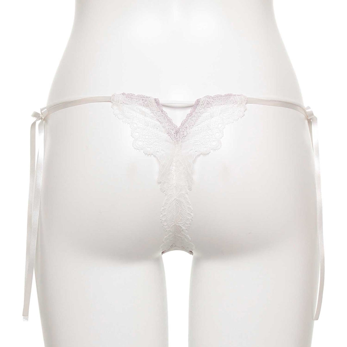 大輪の花が咲き溢れるエンブロイダリーレースを贅沢に使用したサイドリボンTバックショーツ。リボンは手結びタイプですが、ストリングコードとのダブル使いで、解けても脱げない安心仕様。バックのトライアングホールにクロスしたコードがドラマティックなデザインです。