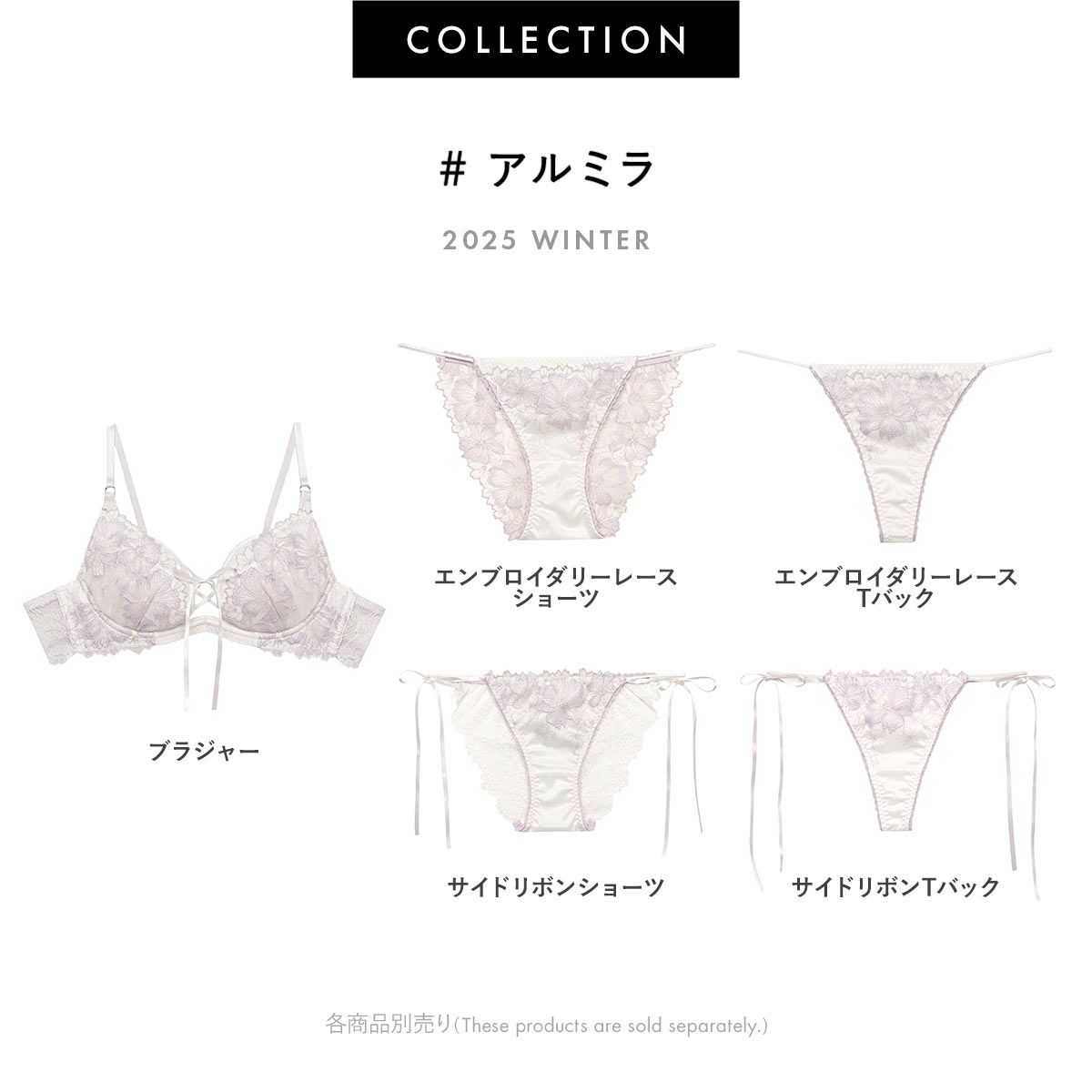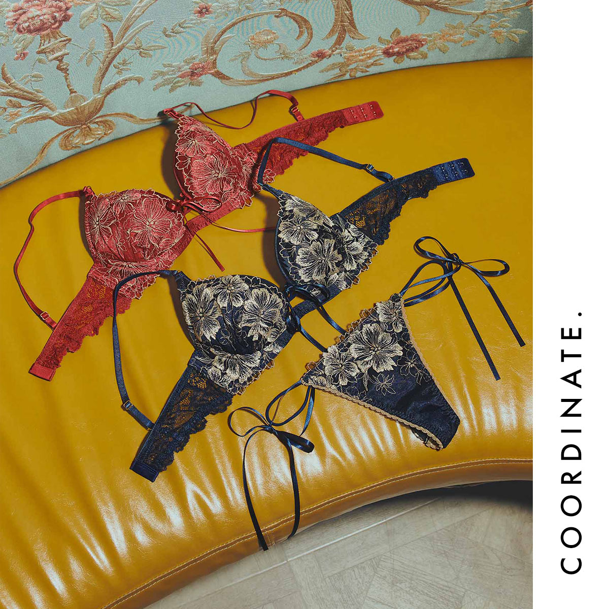 優雅な気品と可憐な艶で魅せるコレクション【アルミラ】。洗練された大人の魅力を引き出します。大輪のフラワーレースに濡れたように輝く大粒のラメが、肌を気高く輝かせます。