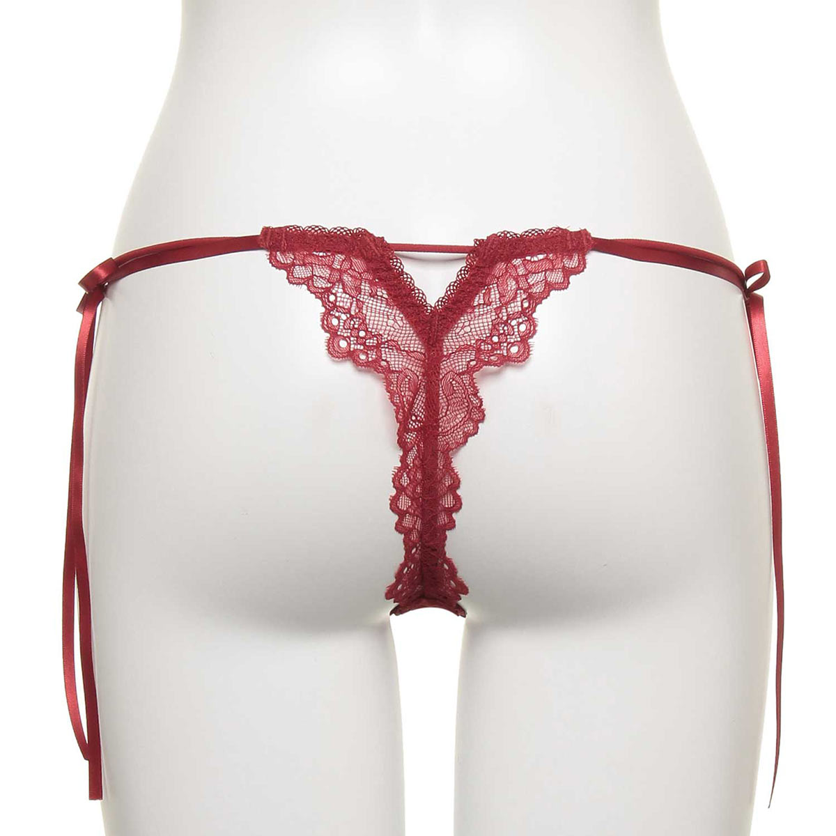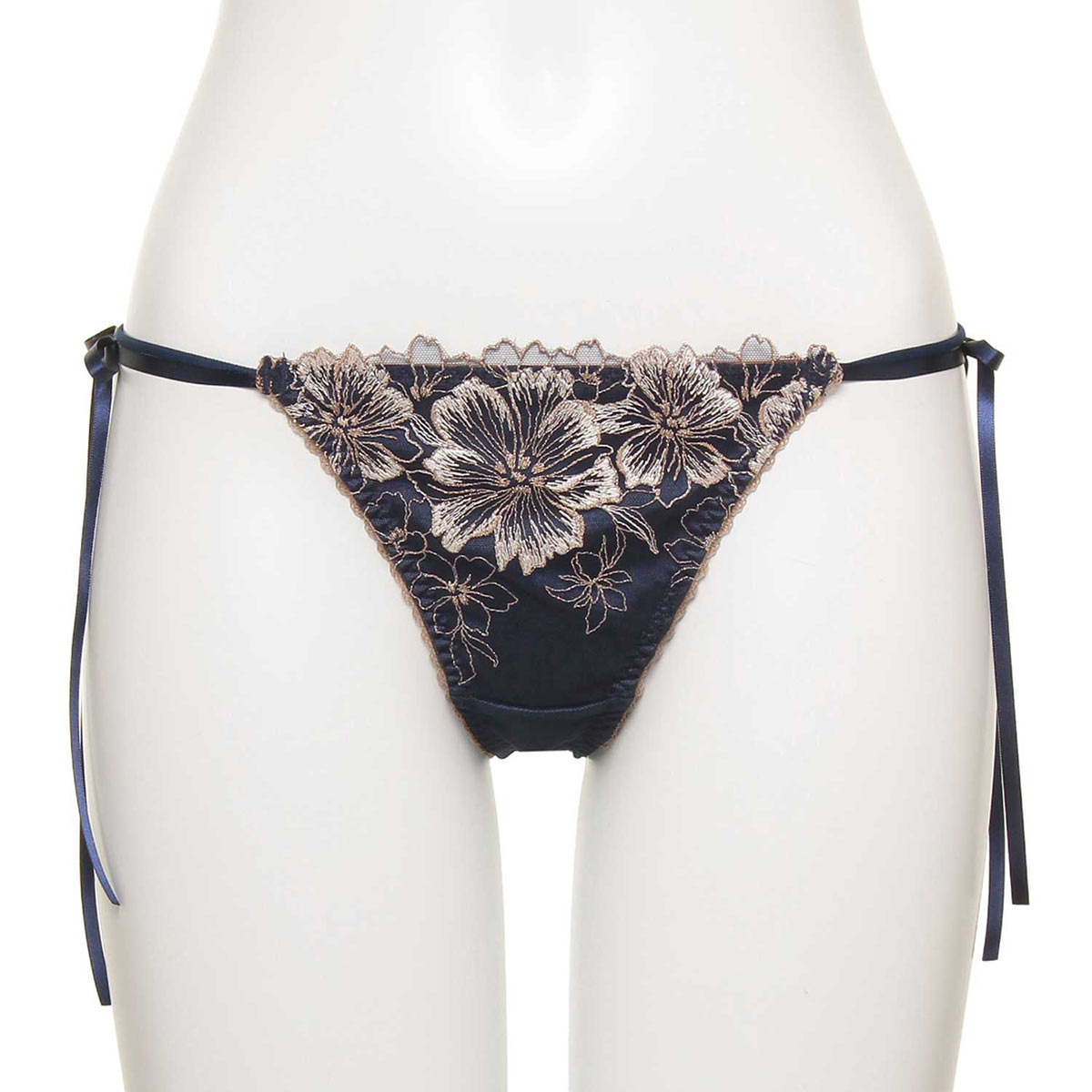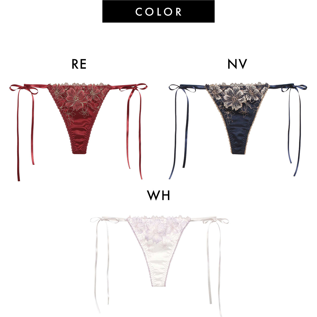 大輪の花が咲き溢れるエンブロイダリーレースを贅沢に使用したサイドリボンTバックショーツ。リボンは手結びタイプですが、ストリングコードとのダブル使いで、解けても脱げない安心仕様。バックのトライアングホールにクロスしたコードがドラマティックなデザインです。
