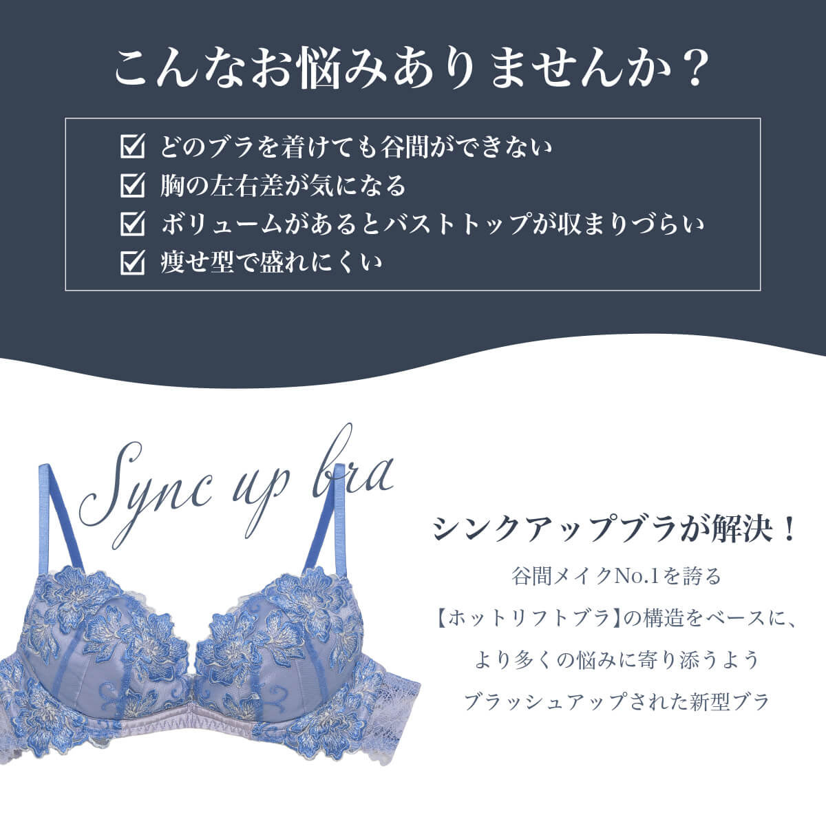 ブラタイプはRAVIJOURの谷間メイクNo.1ブラ【ホットリフト】の構造をベースに、さらに多くのお悩みに寄り添うようブラッシュアップされた待望の新型【シンクアップブラ】。厚手のカップに加え、カップの約9割を占める極厚プッシュアップパッドで、バストをしっかり寄せて上げ、理想的な谷間をメイクします。