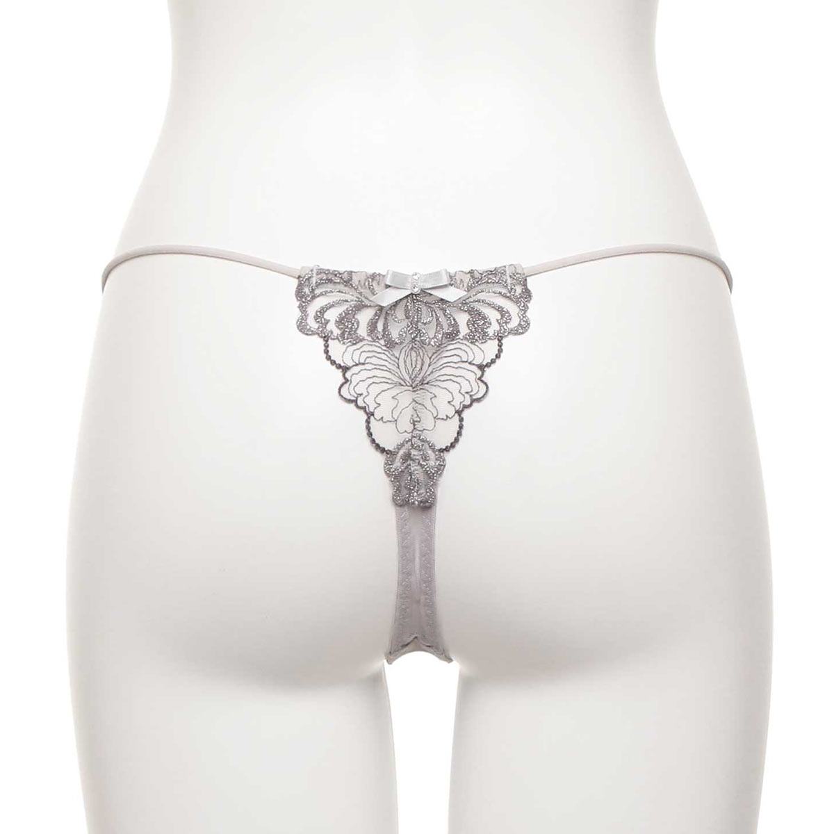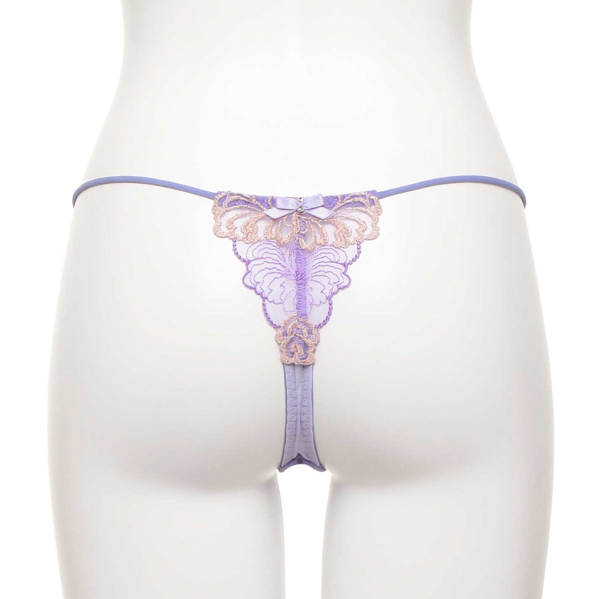 バックに贅沢にエンブロイダリーレースを使用したTバックショーツ。バックの中心のパール付きの小さなリボンが愛らしさを演出します。