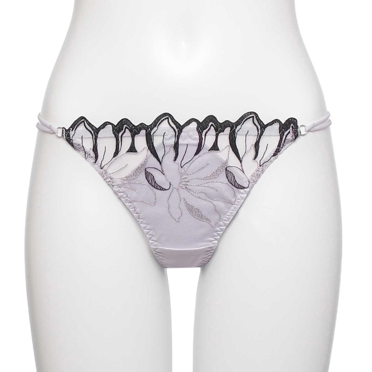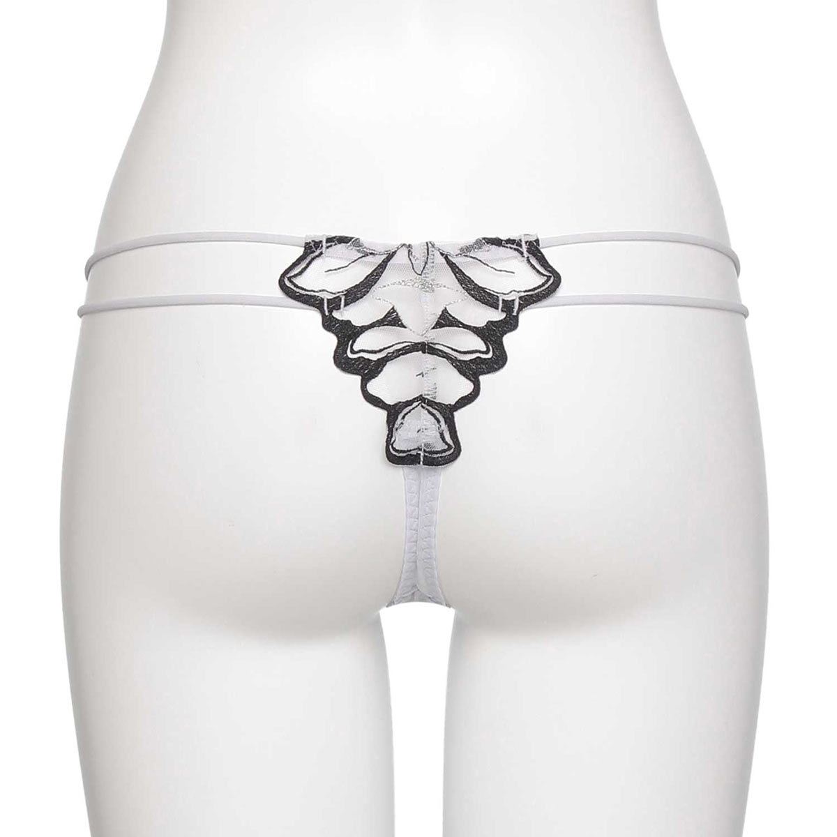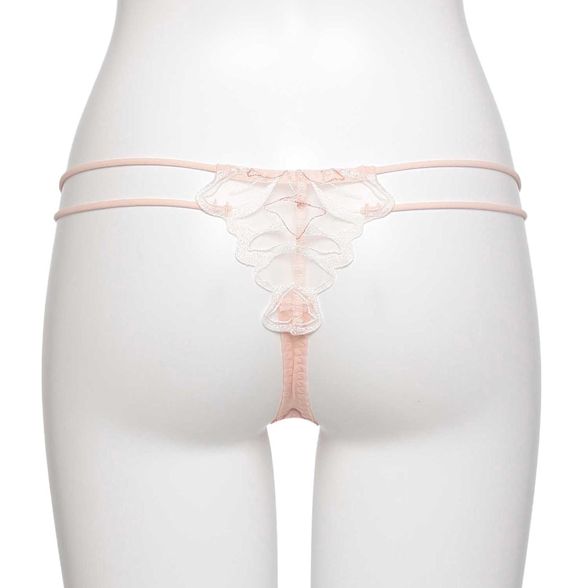 バックに華やかなエンブロイダリーレースを贅沢に使用したTバックショーツ。透けるチュールに重なる花びらを描いた華やかなデザイン。サイドはストリングコードから素肌をそっと覗かせ、可憐さの奥にひとさじの大胆さを。