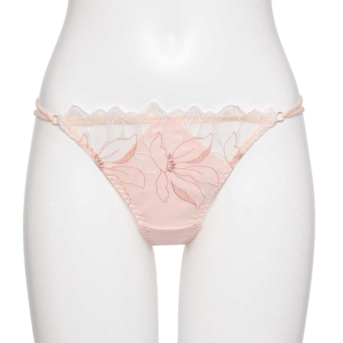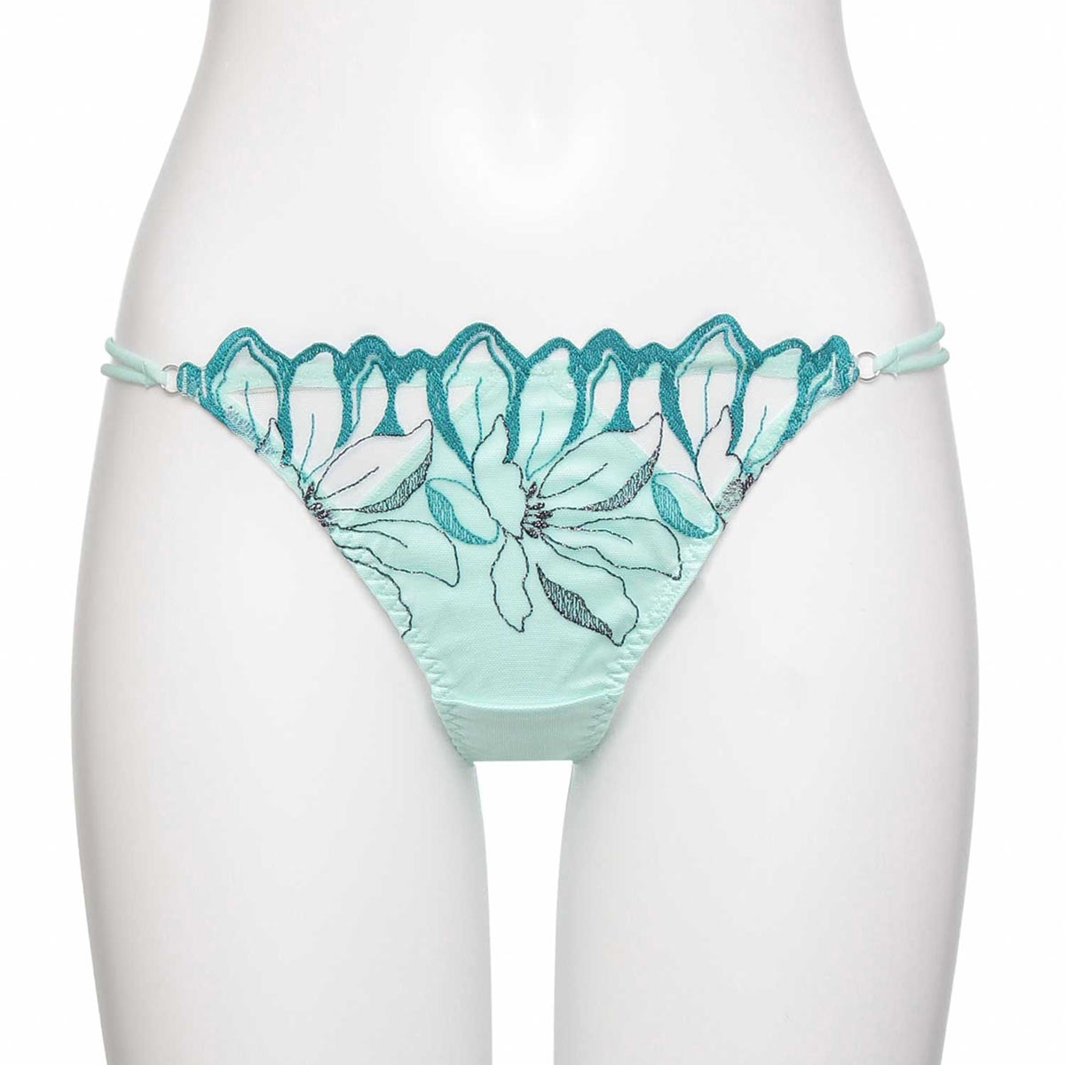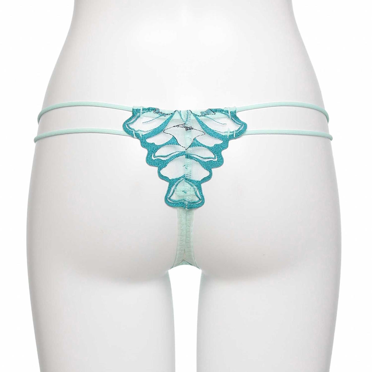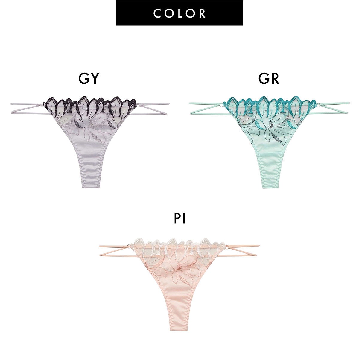 バックに華やかなエンブロイダリーレースを贅沢に使用したTバックショーツ。透けるチュールに重なる花びらを描いた華やかなデザイン。サイドはストリングコードから素肌をそっと覗かせ、可憐さの奥にひとさじの大胆さを。