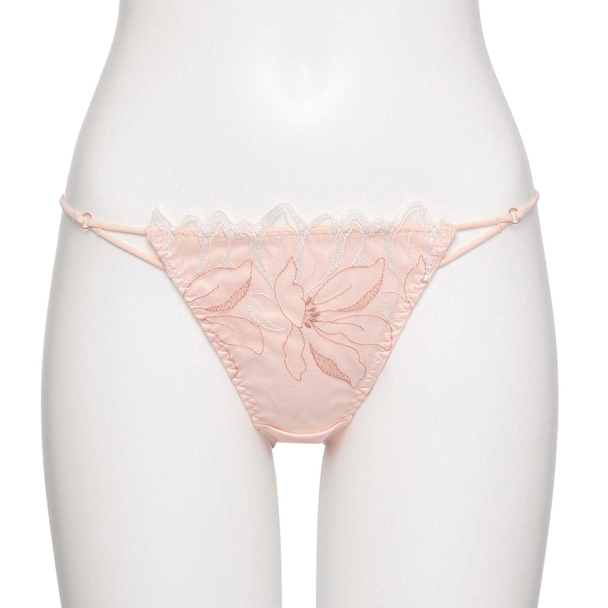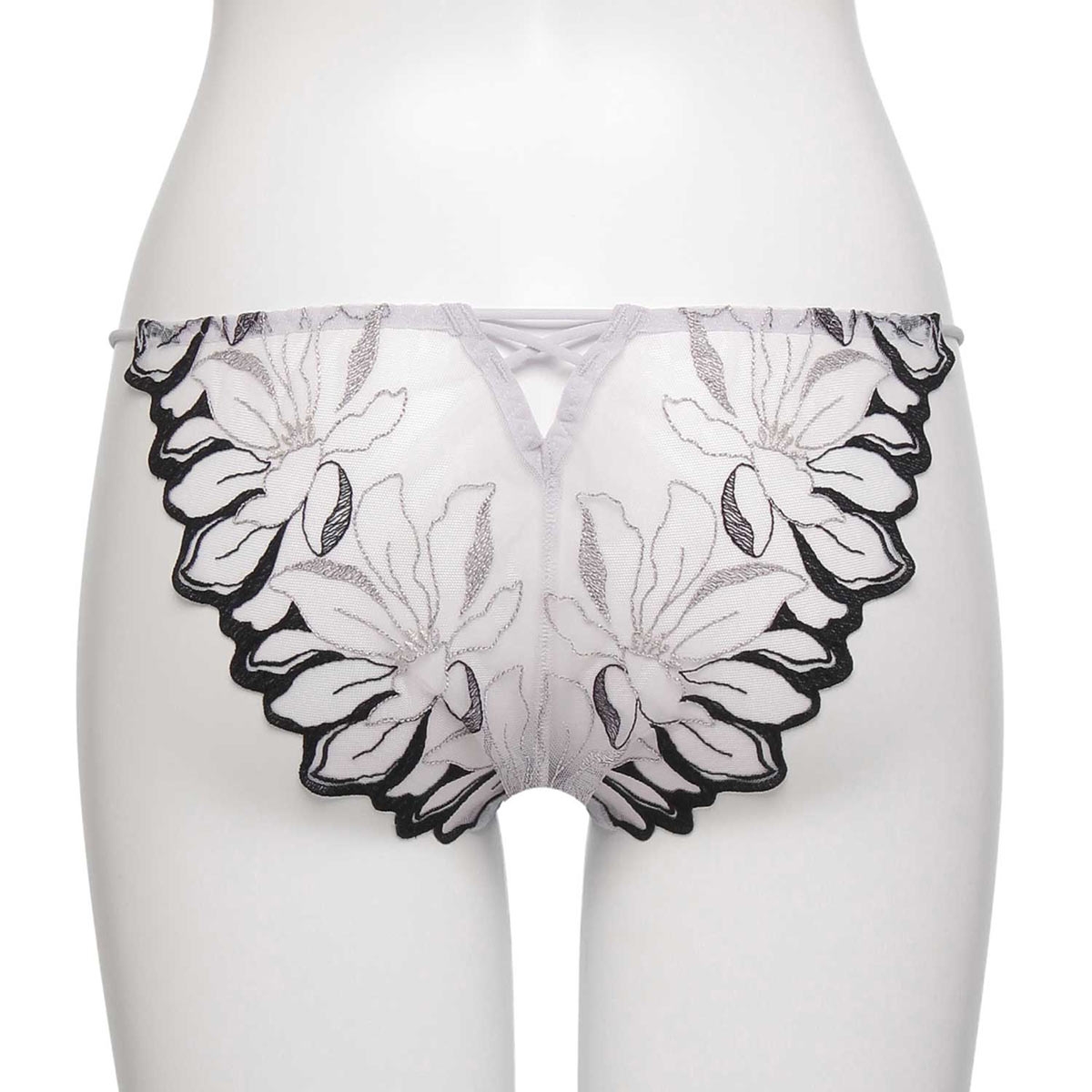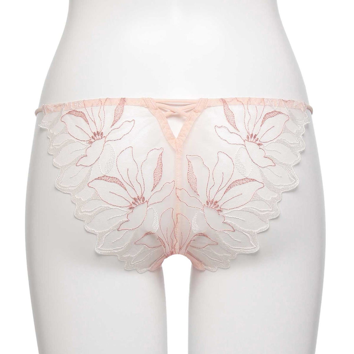 ストレッチレースがヒップに添う快適なはき心地のノーマルショーツ。バックの小さなトライアングルホールに、クロスするストリングコードが、可憐さの奥にひとさじの大胆さを感じさせるデザイン。