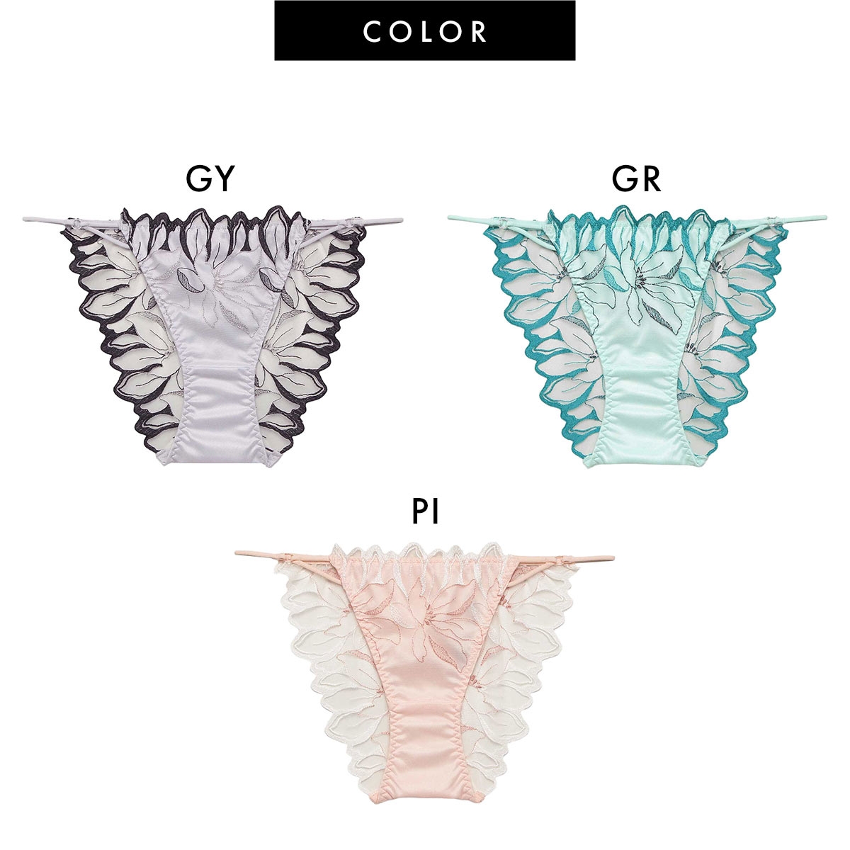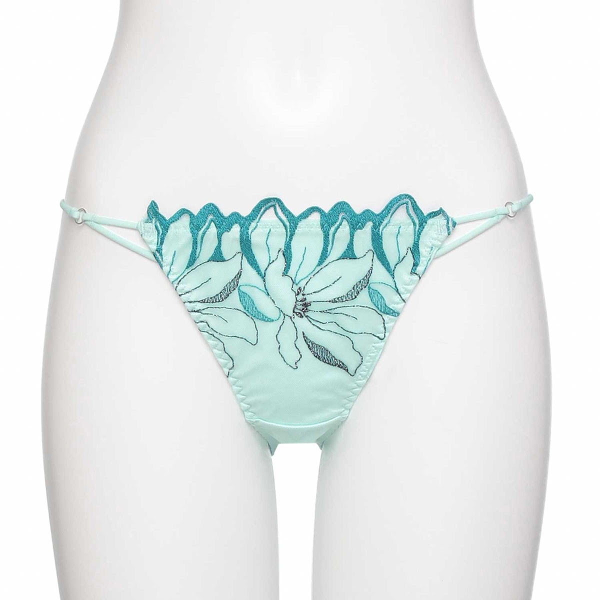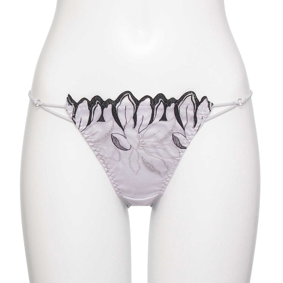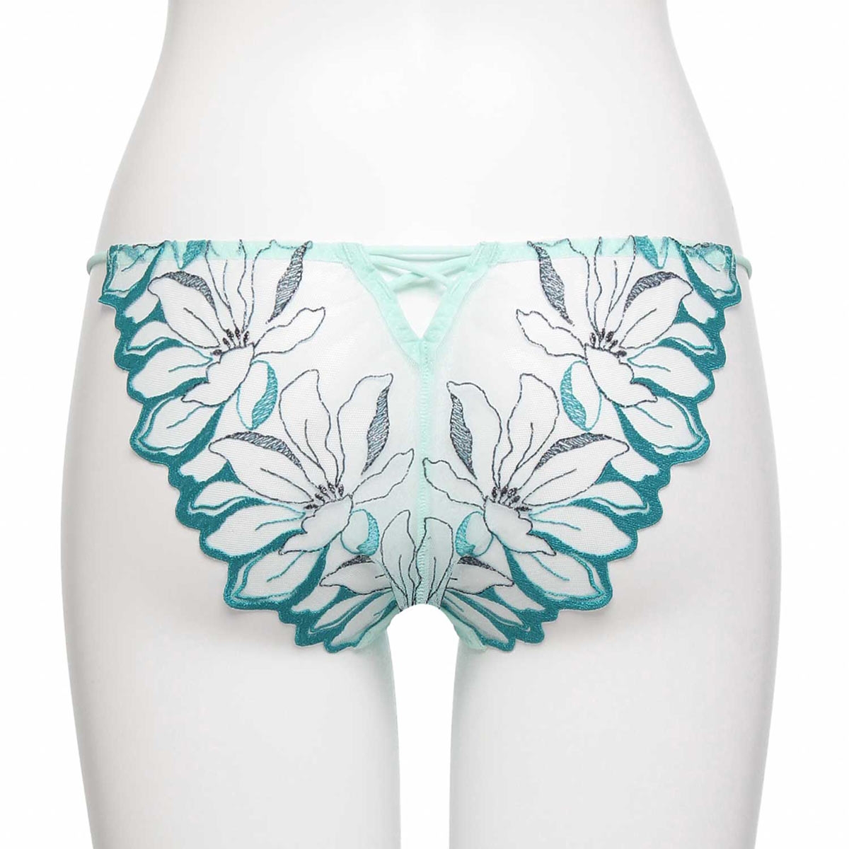 ストレッチレースがヒップに添う快適なはき心地のノーマルショーツ。バックの小さなトライアングルホールに、クロスするストリングコードが、可憐さの奥にひとさじの大胆さを感じさせるデザイン。