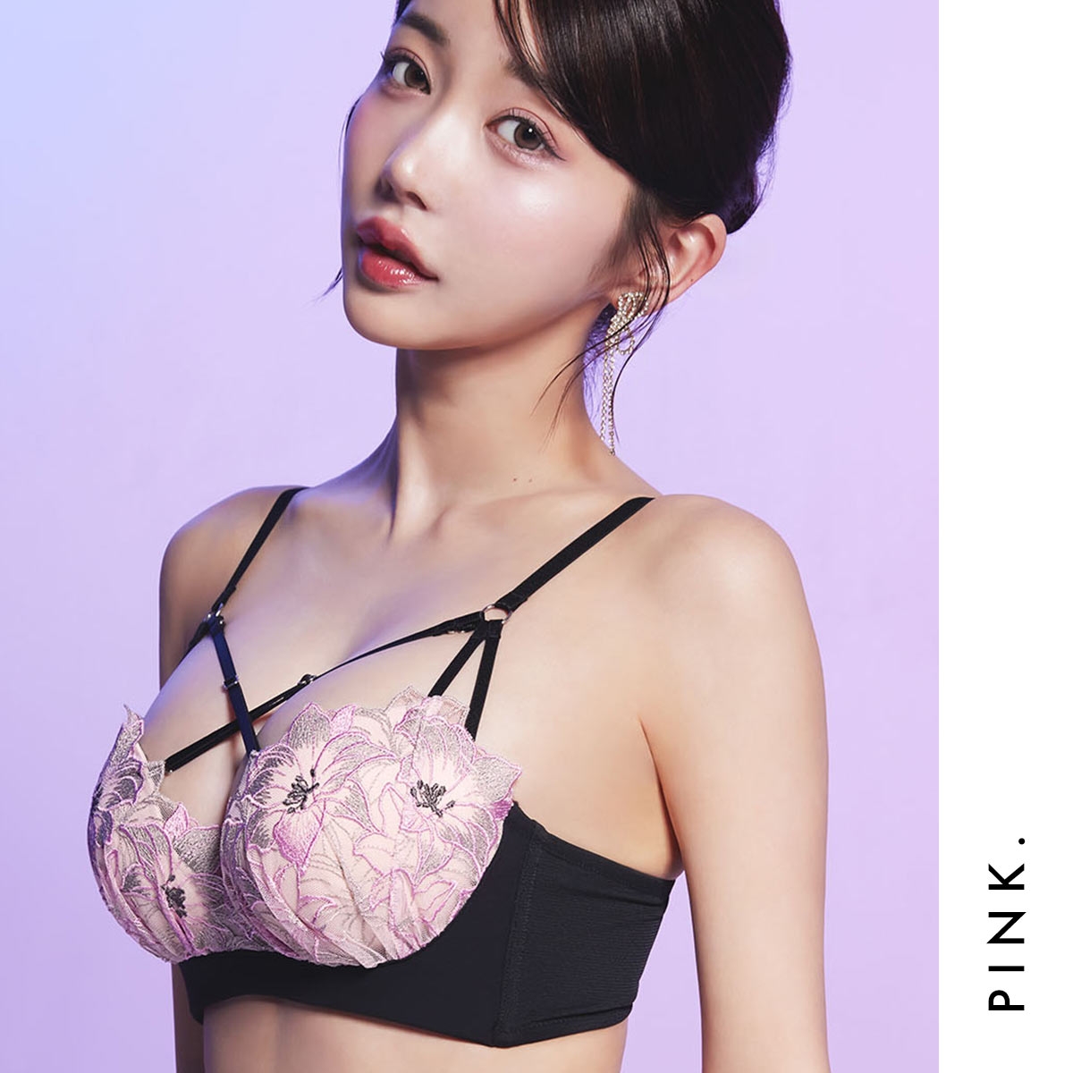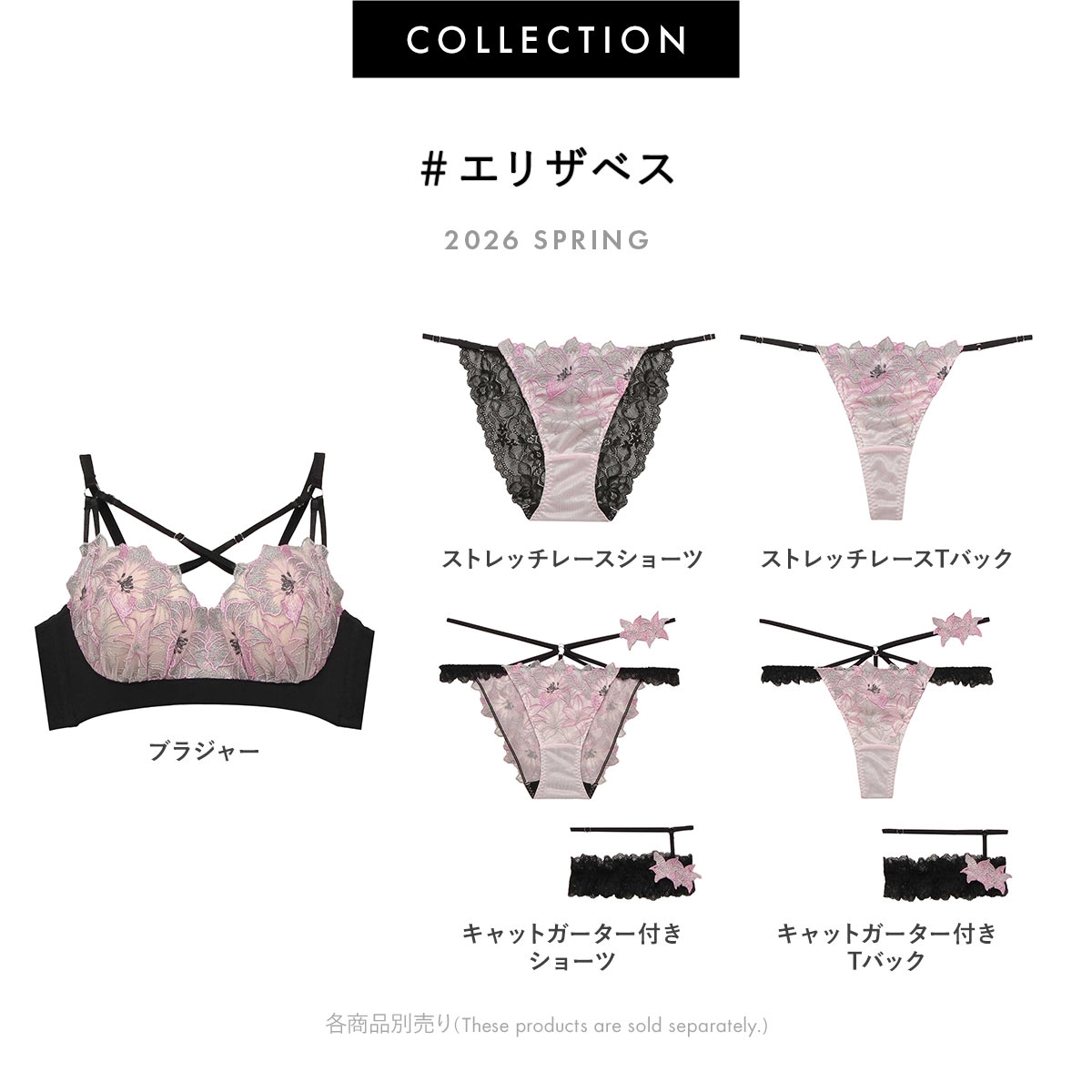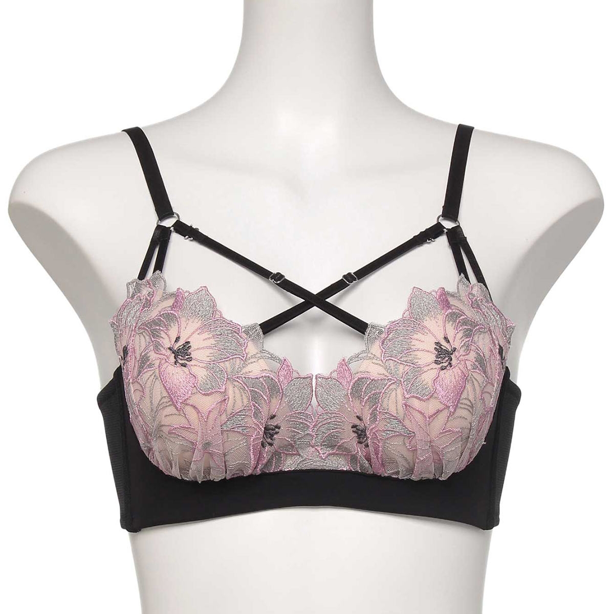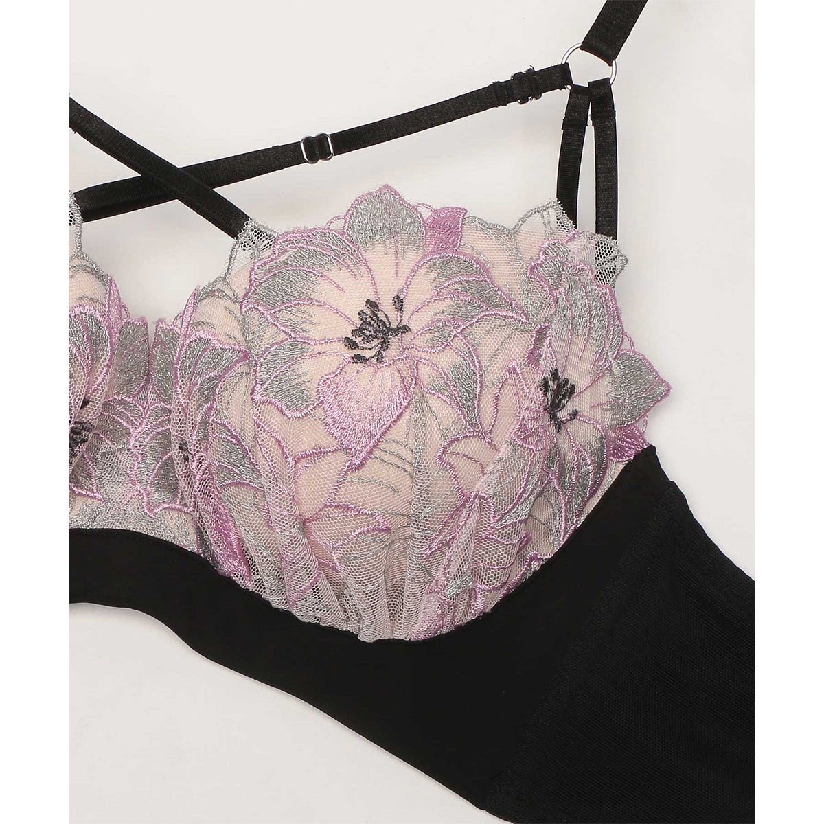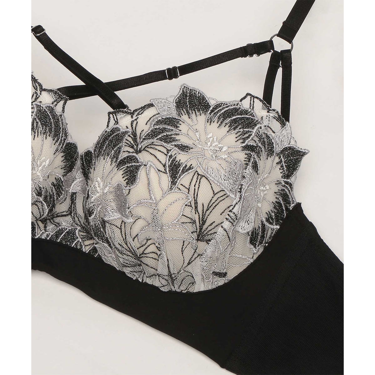 豪華な刺繍に光り輝くラメを織りなす大輪の花がエレガントなデザイン。オリジナルのエンブロイダリーレースを黒いパーツで引き締め、シャープな印象に。デコルテに映えるクロスストラップが視線を惹き付け、大人の色気を醸すコレクションです。
