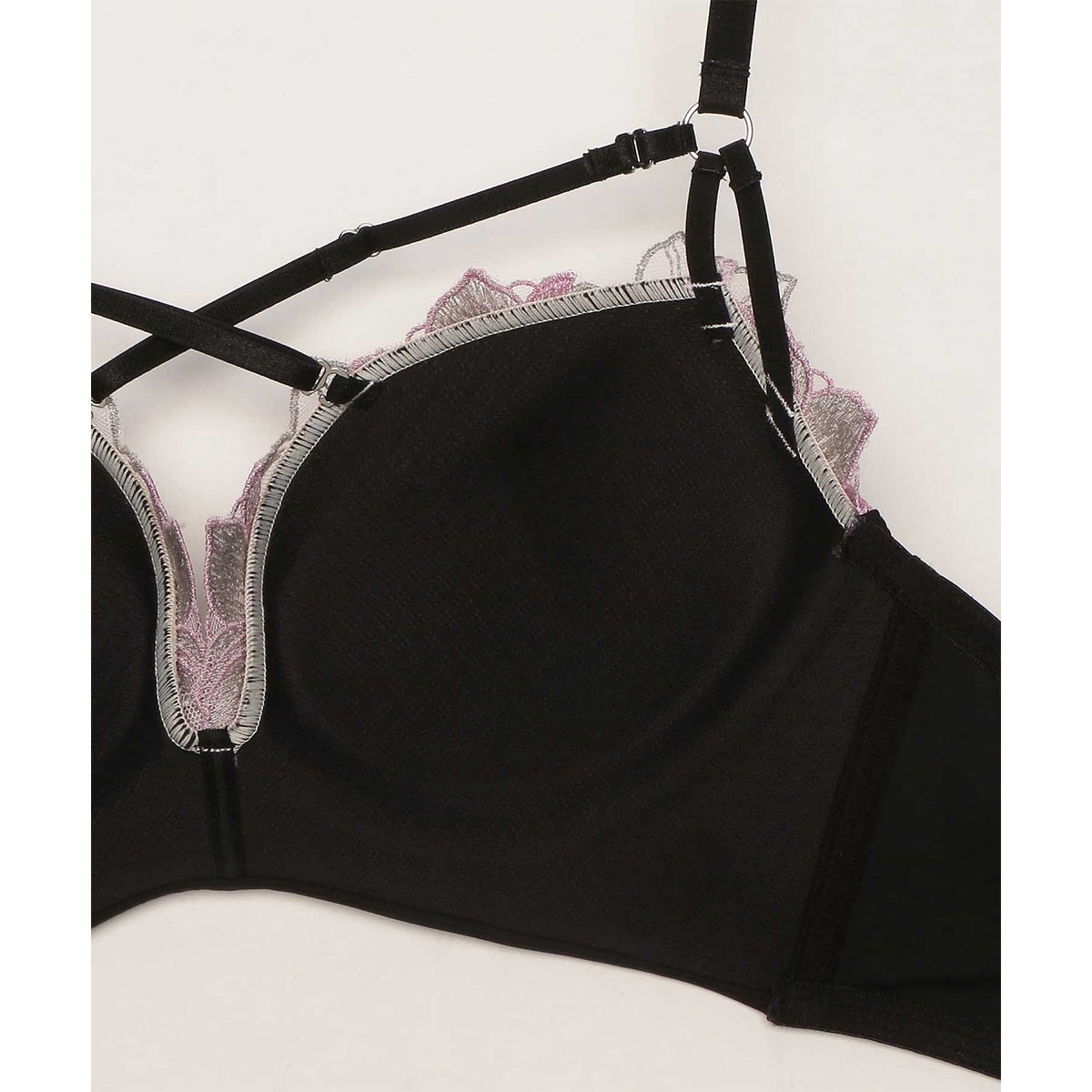 胸元のクロスコードは取り外し&アジャスター調整可能。バストを中心に引き寄せ深い谷間を強調します。