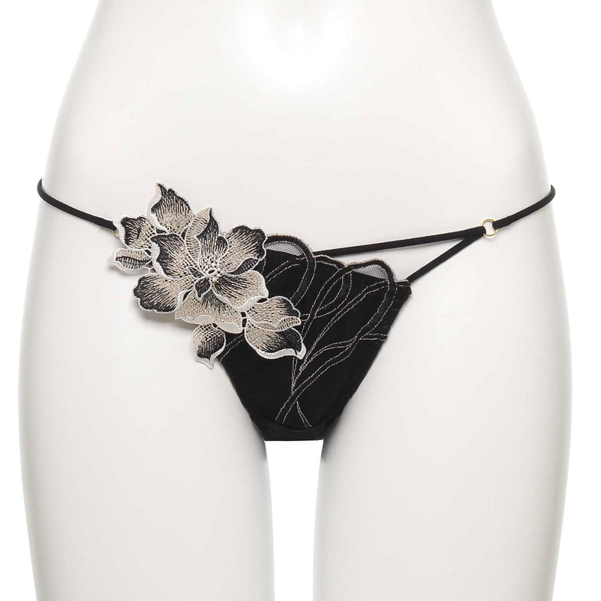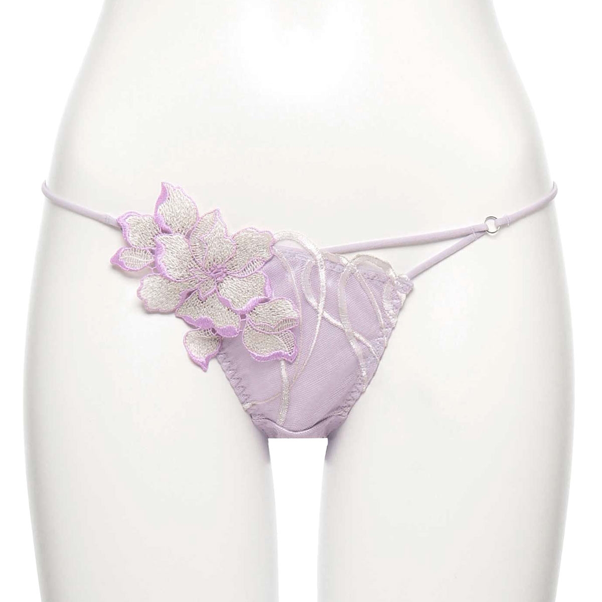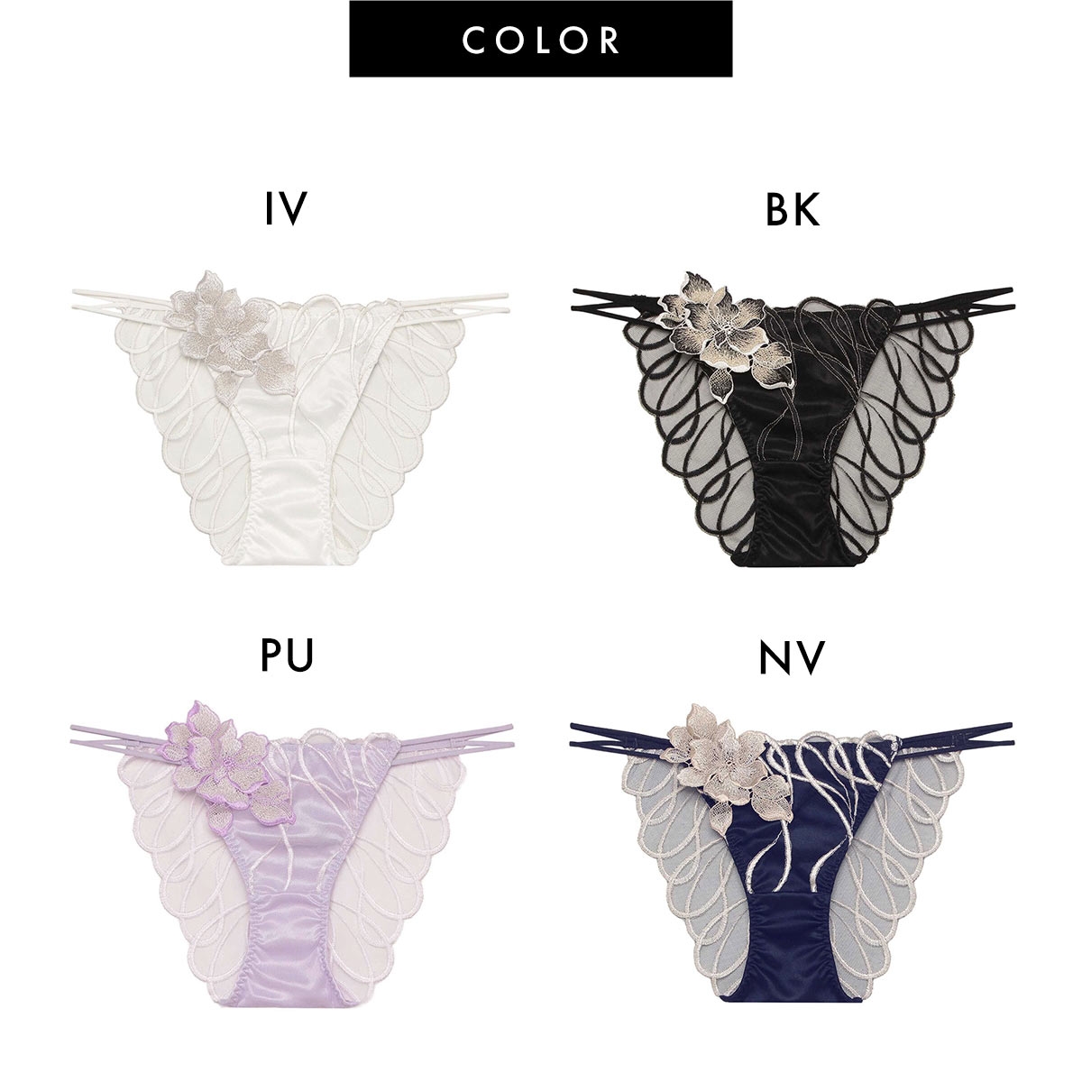 バックに伸びの良いストレッチレースを使用した、快適なフィット感のノーマルショーツ。フロントサイドにあしらわれた大ぶりのフラワーモチーフが、華やかで印象的な美しさを演出。サイドコードはアシンメトリーデザインで、洗練された印象と軽やかな色気を感じるデザインです。