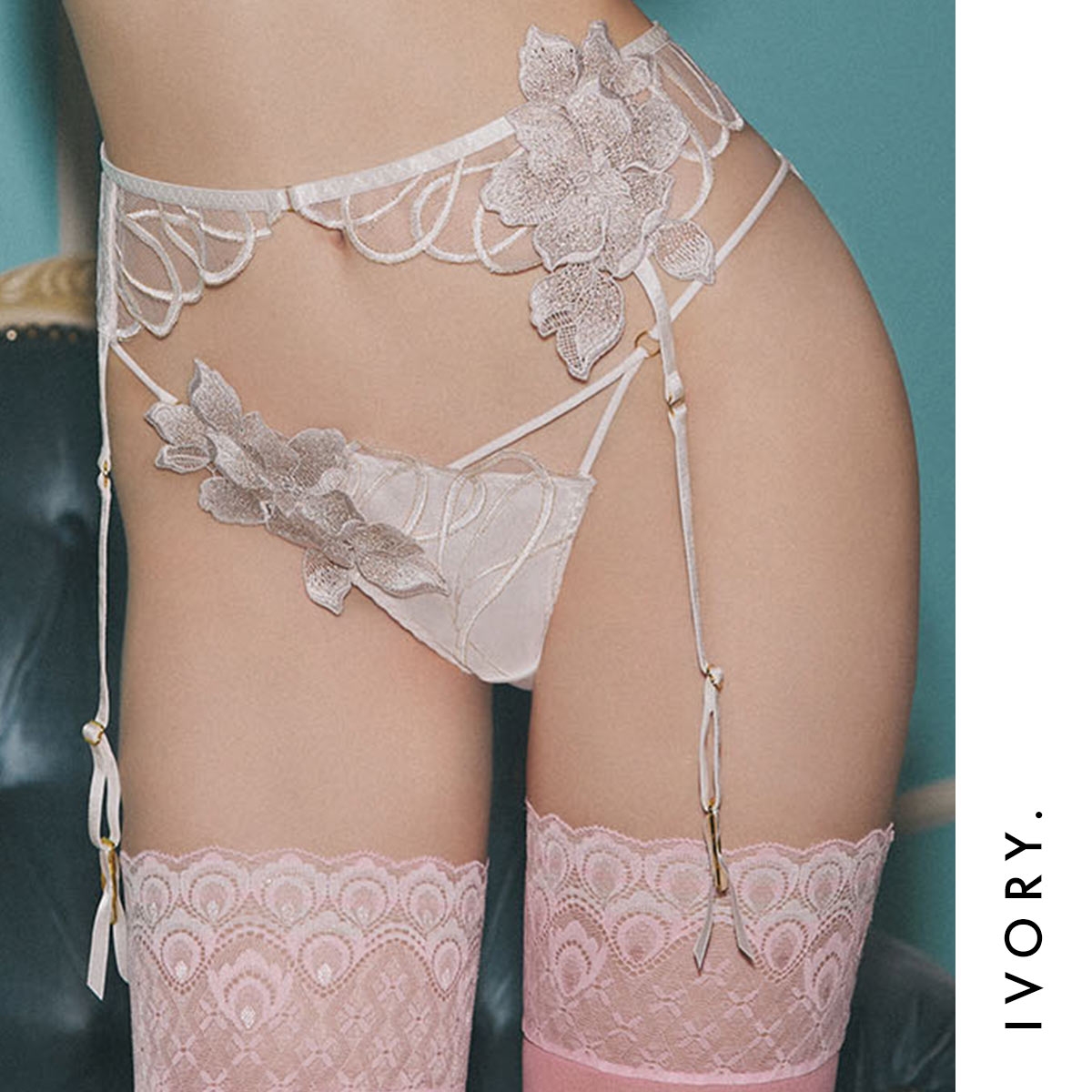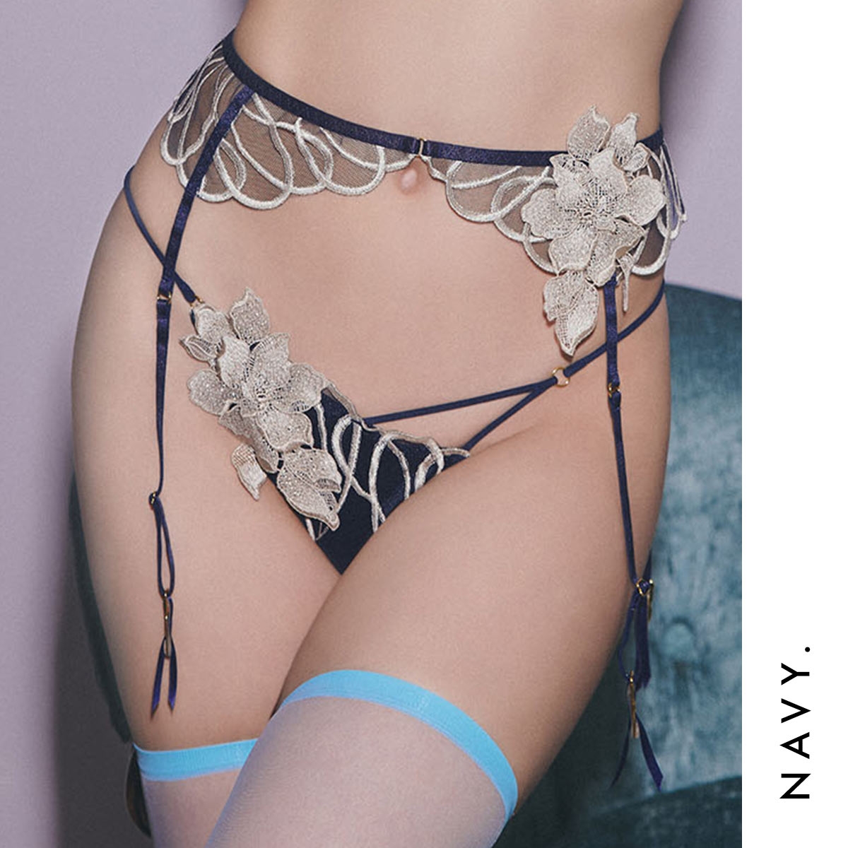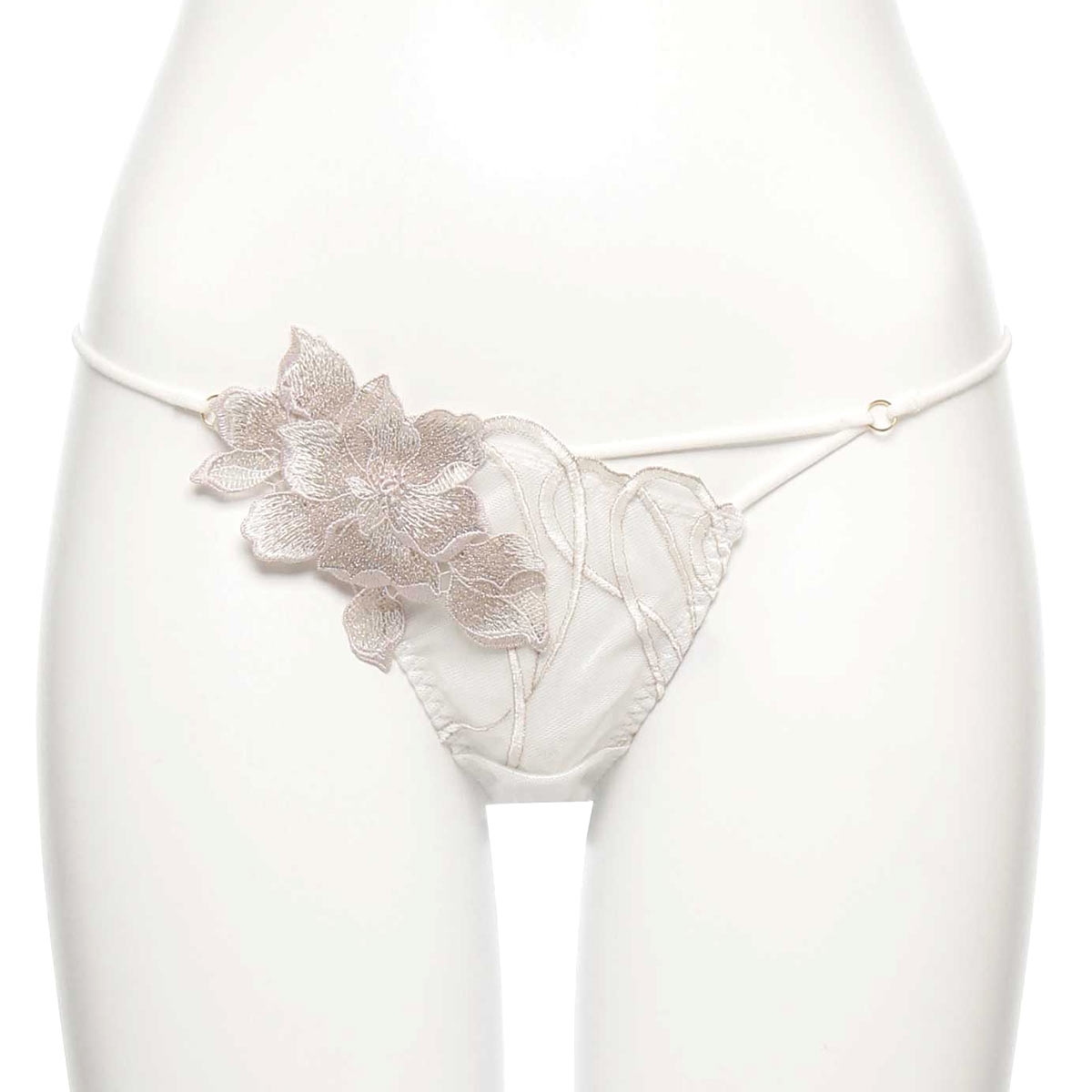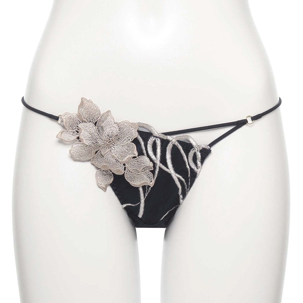 バックに伸びの良いストレッチレースを使用した、快適なフィット感のノーマルショーツ。フロントサイドにあしらわれた大ぶりのフラワーモチーフが、華やかで印象的な美しさを演出。サイドコードはアシンメトリーデザインで、洗練された印象と軽やかな色気を感じるデザインです。