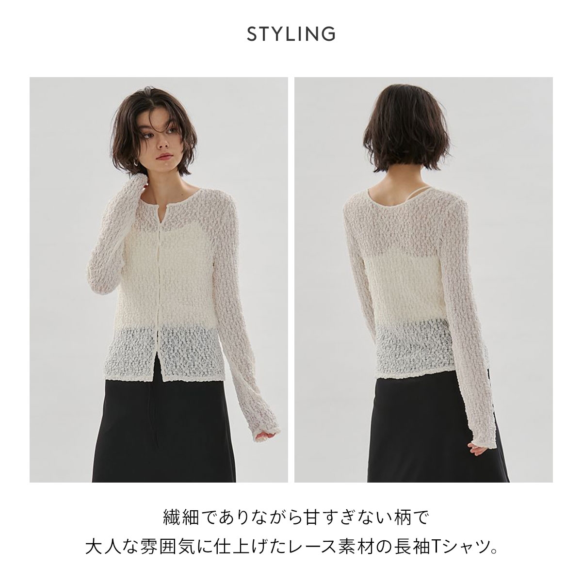 繊細でありながら甘すぎない柄で大人な雰囲気に仕上げたレース素材の長袖Tシャツ。