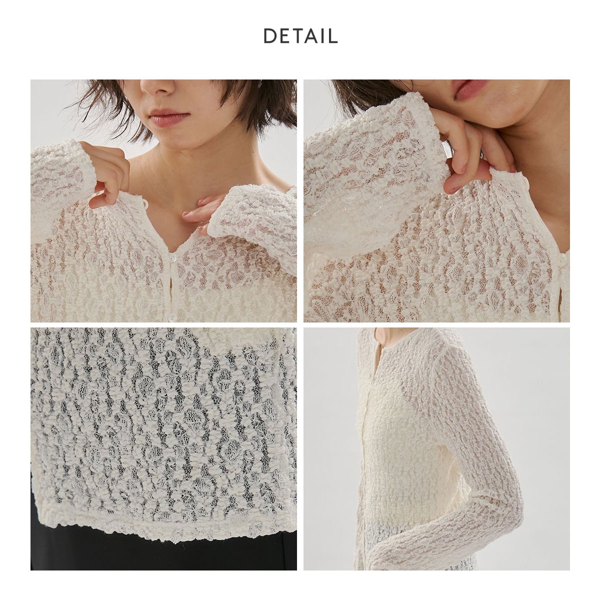 生地表面の凹凸がニュアンスのある表情を生み出し、ほどよい透け感と相まって、女性らしく華やかな雰囲気を演出してくれます。