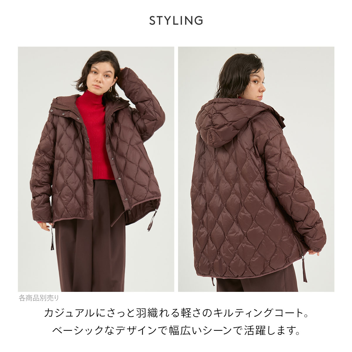 こちらは、カジュアルにさっと羽織れる軽さのキルティングコートです。ベーシックなデザインでタウンユースからアウトドアシーンにも活躍します。