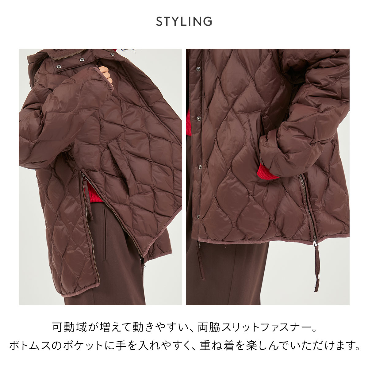 TAIONのMILITARY LINEの特徴となる両脇スリットファスナーは、可動域が増える事で動きやすくなり、ボトムスのポケットに手を入れやすく、重ね着をお楽しみいただける仕様となっております。