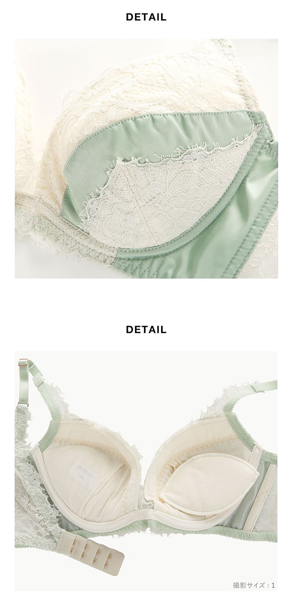 カップ部分は、取り外し可能なパッド入り。脇に高さがあり前中心が浅いワイヤーを使用しているので、軽い着け心地ながらも、しっかりと寄せたバストと谷間をキープしてくれます。バック部分は、背中の食い込みを軽減し、ストラップがずれ落ちにくいU字型です。
