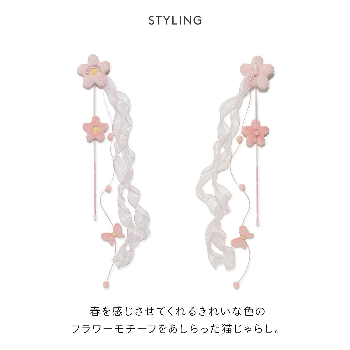 蝶々の飾りやくるくると動くリボンが、愛猫の好奇心を誘います。