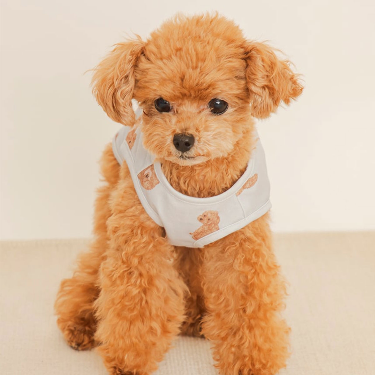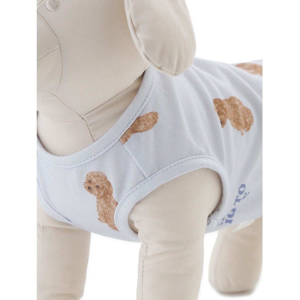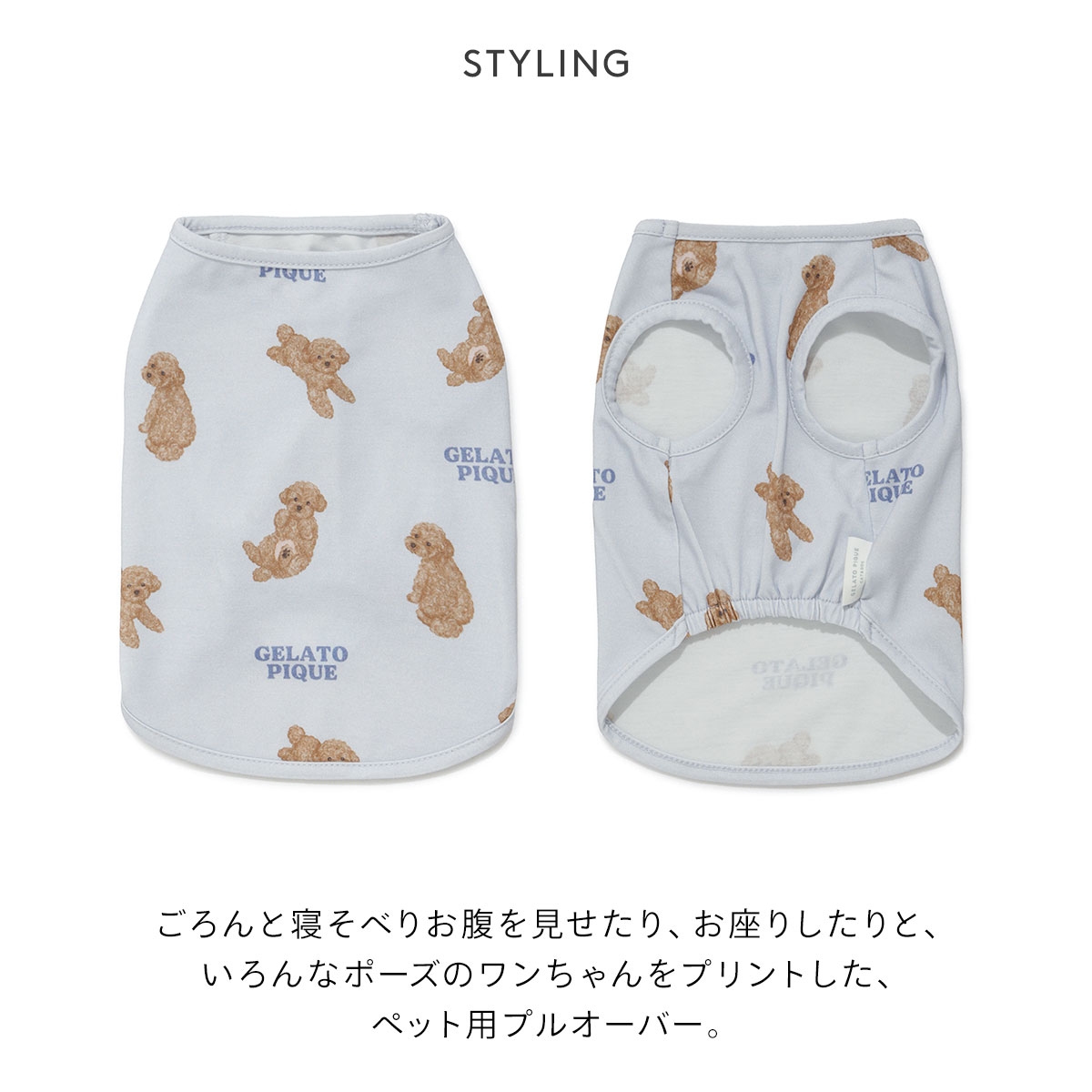 ごろんと寝そべりお腹を見せたり、お座りしたりと、いろんなポーズのワンちゃんをプリントした、ペット用プルオーバー。