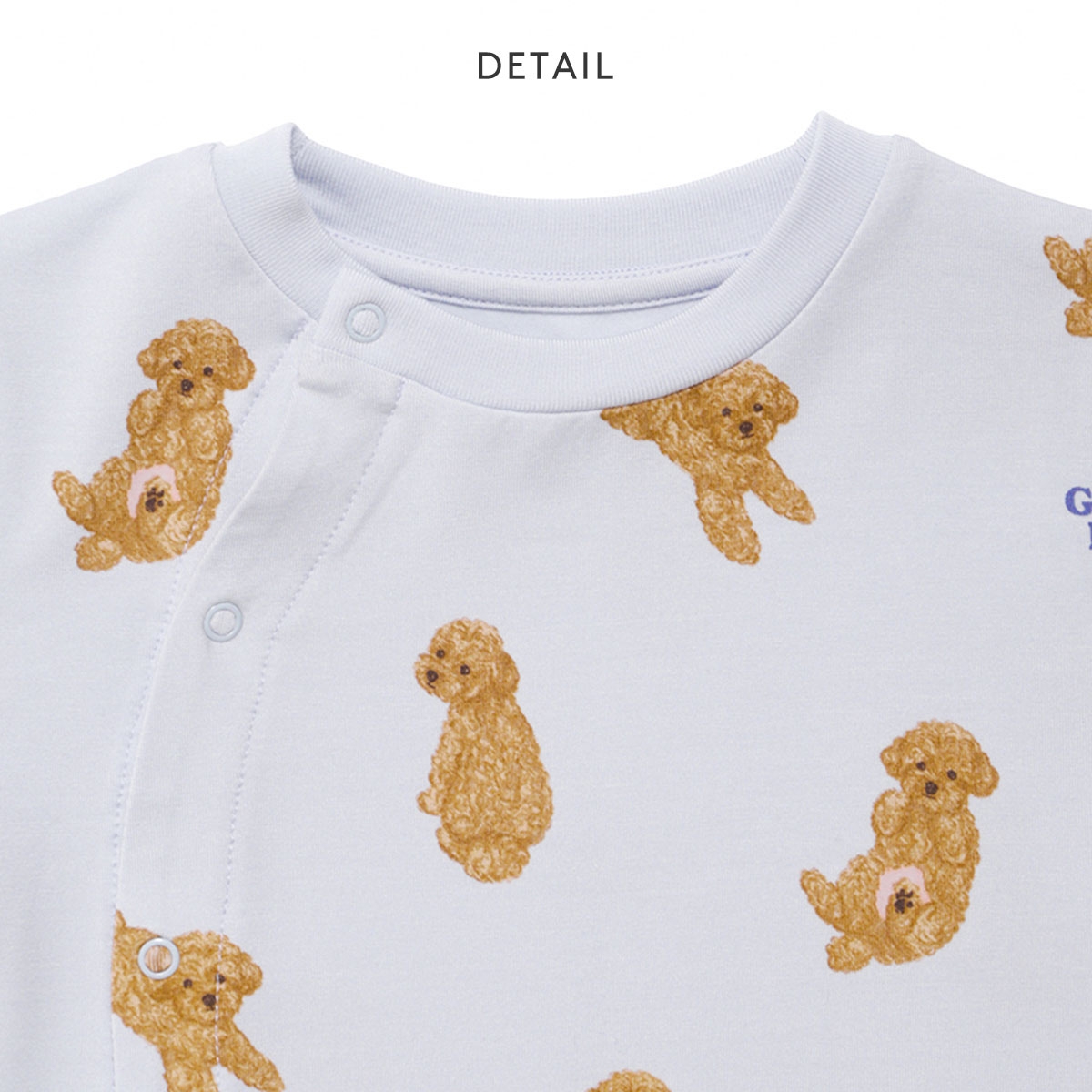 ごろんと寝そべりお腹を見せたり、お座りしたりと、いろんなポーズのワンちゃんをプリントしたドッグ柄ロンパース。