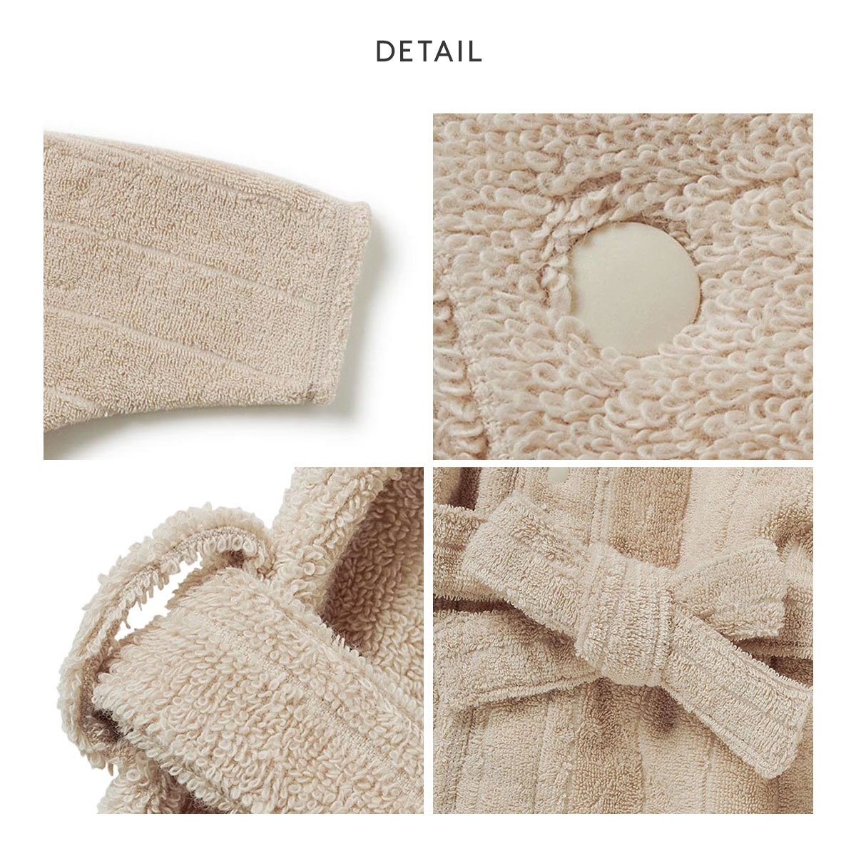 甘撚り糸のふんわり柔らかな肌触りと、優れた吸水性が魅力のタオルローブ。洗うほどに風合いが増す、綿100%のパイルを使用しているので、長くご使用いただけます。
