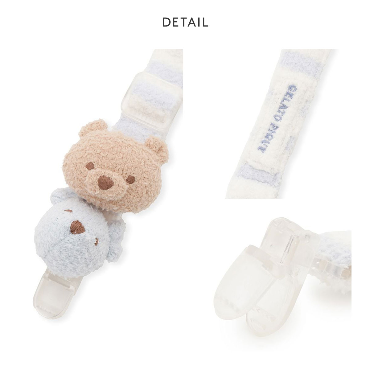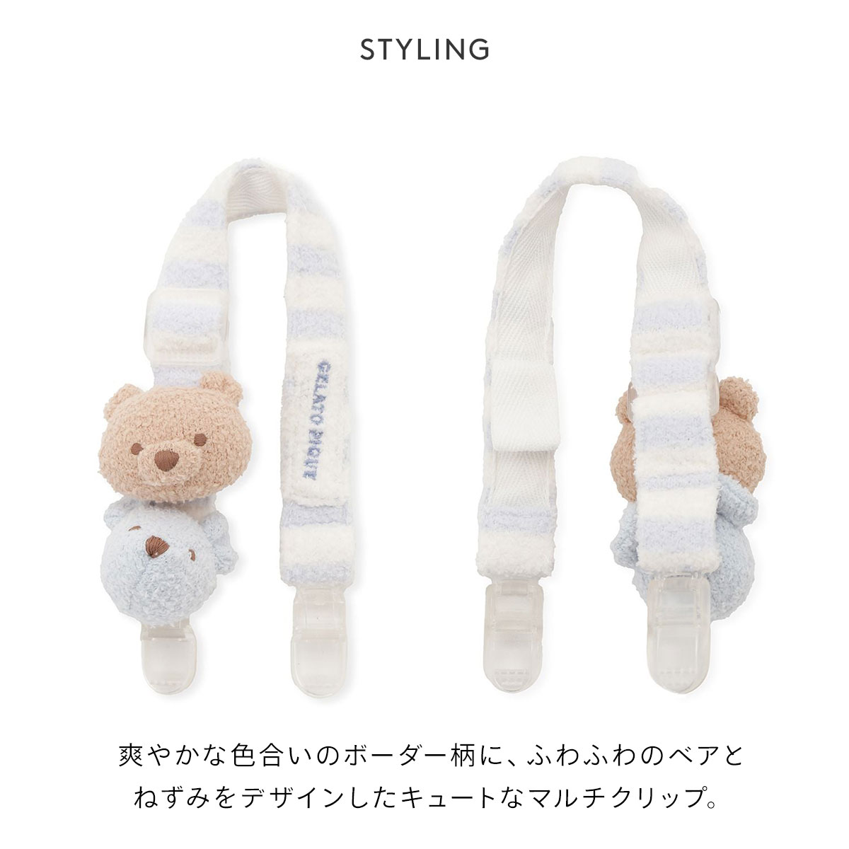 爽やかな色合いのボーダー柄に、ふわふわのベアとねずみをデザインしたキュートなマルチクリップ。ブランドロゴ入りのモコテープがワンポイントであしらわれています。