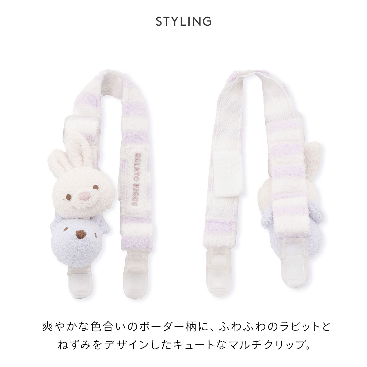 爽やかな色合いのボーダー柄に、ふわふわのラビットとねずみをデザインしたキュートなマルチクリップ。ブランドロゴ入りのモコテープがワンポイントであしらわれています。
