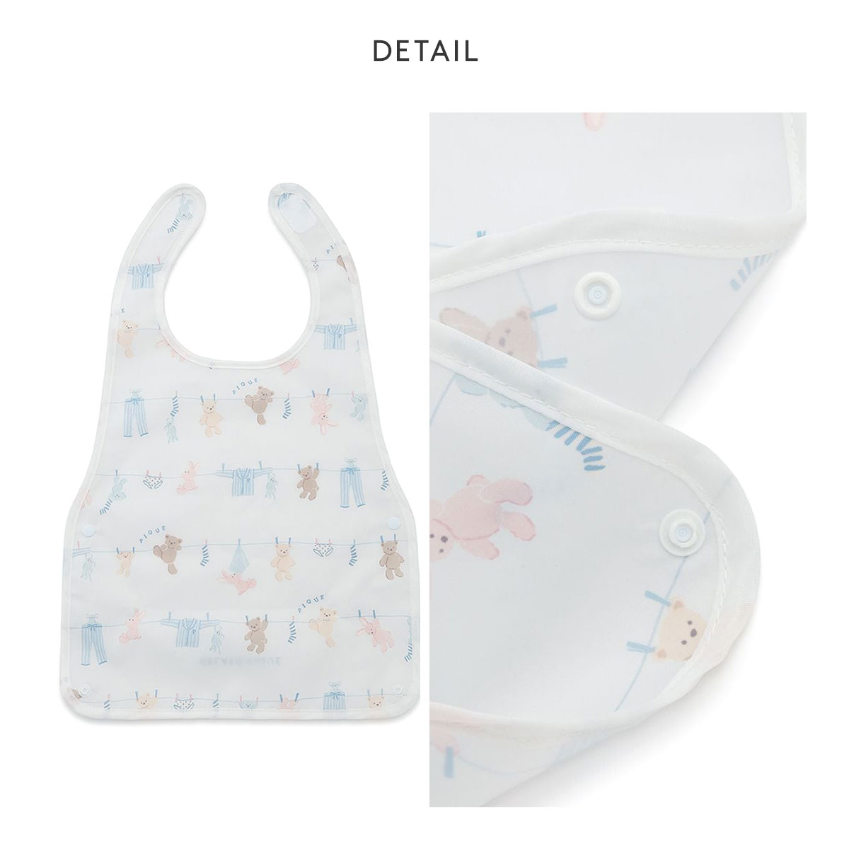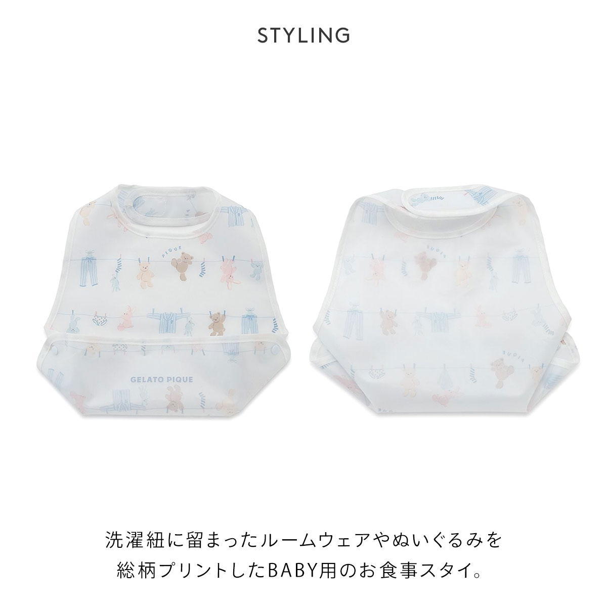 こちらは、洗濯紐に留まったルームウェアやぬいぐるみを総柄プリントしたBABY用のお食事スタイ。