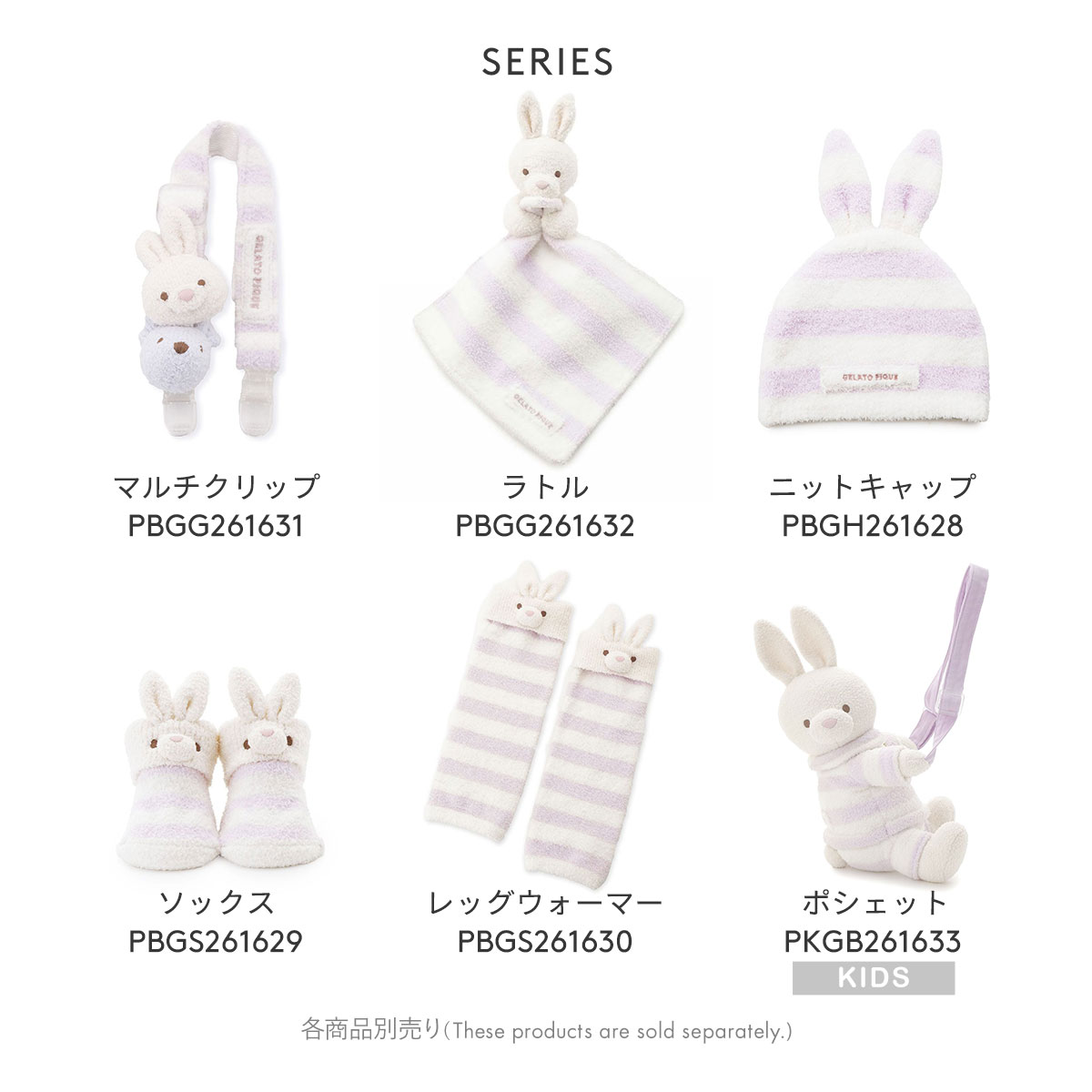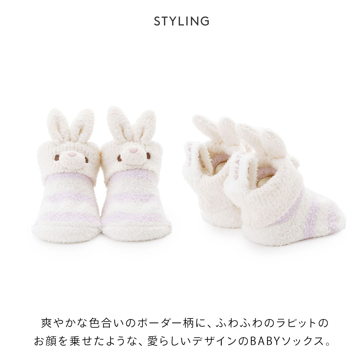 爽やかな色合いのボーダー柄に、ふわふわのラビットのお顔を乗せたような、愛らしいデザインのBABYソックス。表面にはブランドロゴ入りのモコテープもあしらわれています。