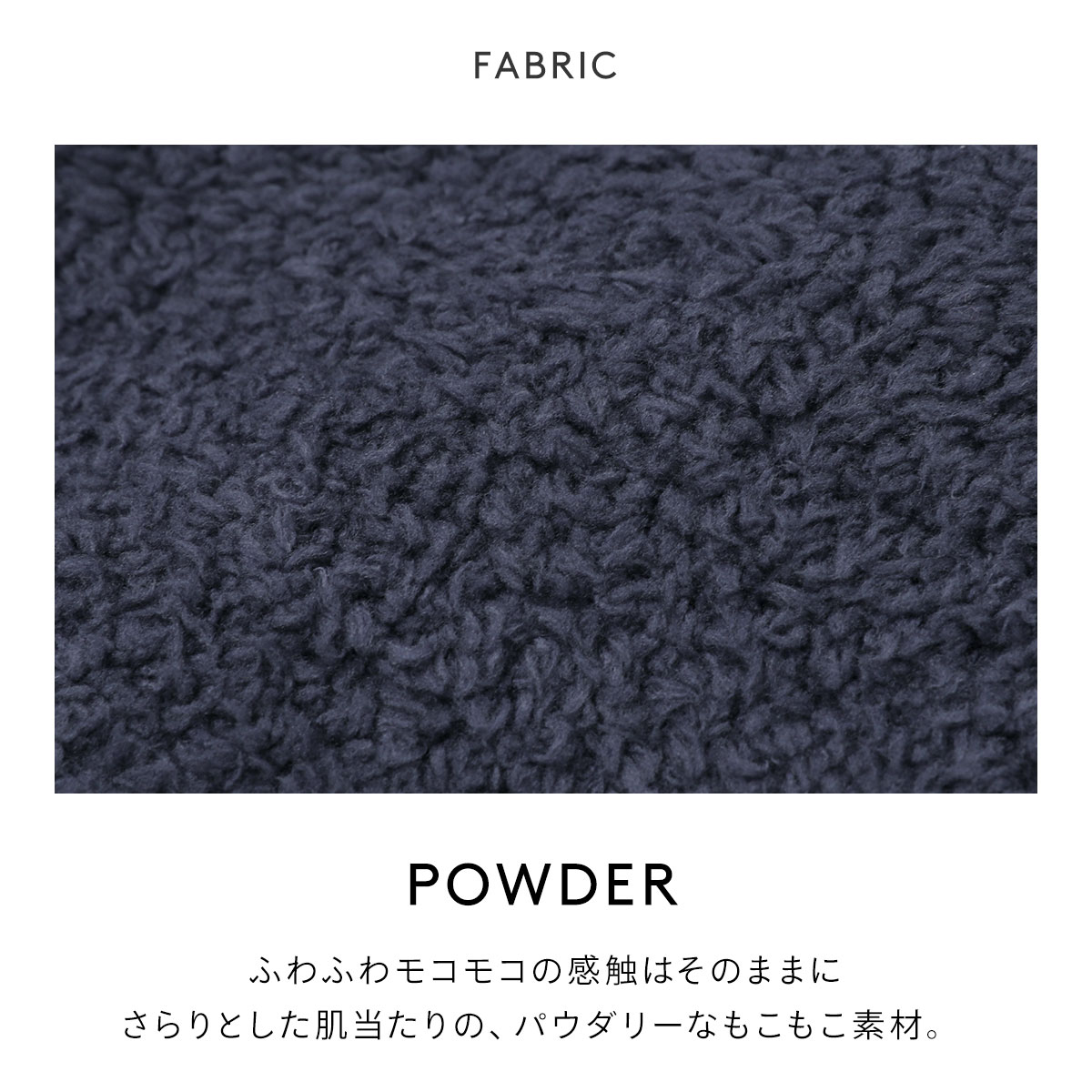 身生地には、さらさらとした質感と軽やかなモコモコ感を兼ね備えたパウダー素材を使用。粉砂糖のようなパウダリータッチと、ゆったりとした着心地がからだを包みます。