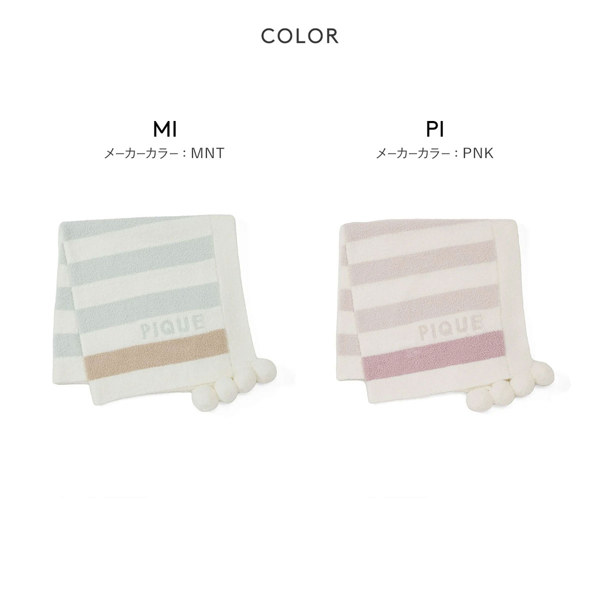 淡いカラーリングのボーダー柄にロゴをあしらい、四隅にはポンポンをつけた、キュートなデザインです。