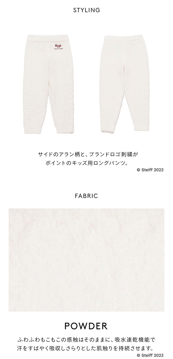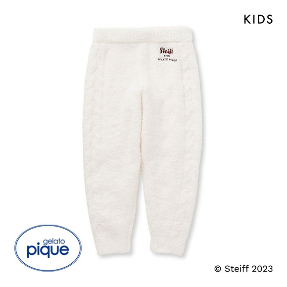こちらは、温もり感のあるサイドのアラン柄と、フロントのブランドロゴ刺繍がポイントの、キッズ用ロングパンツです。