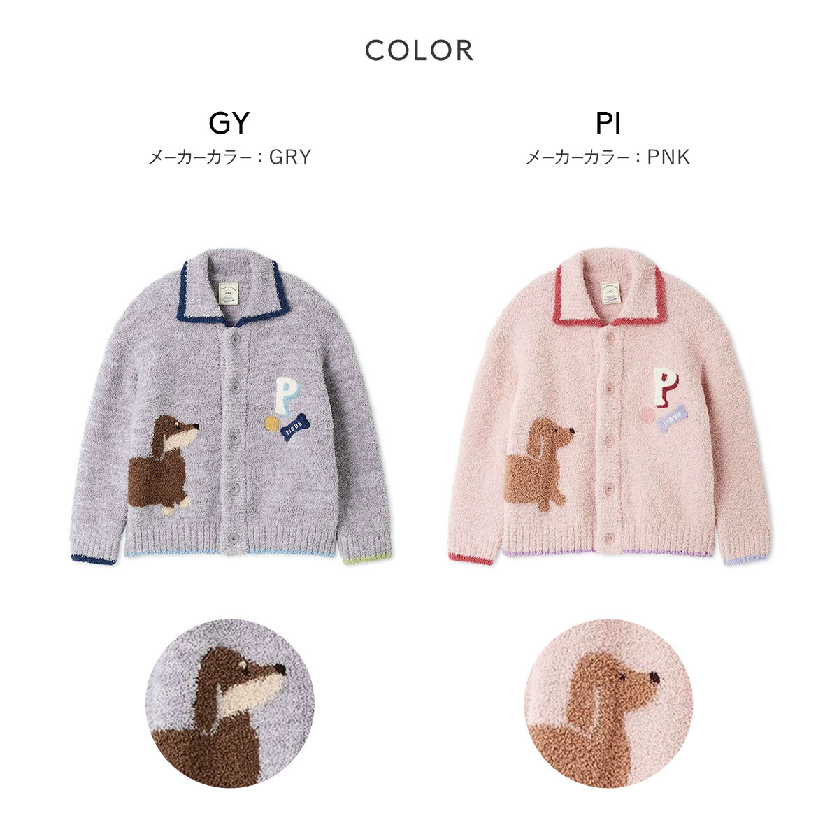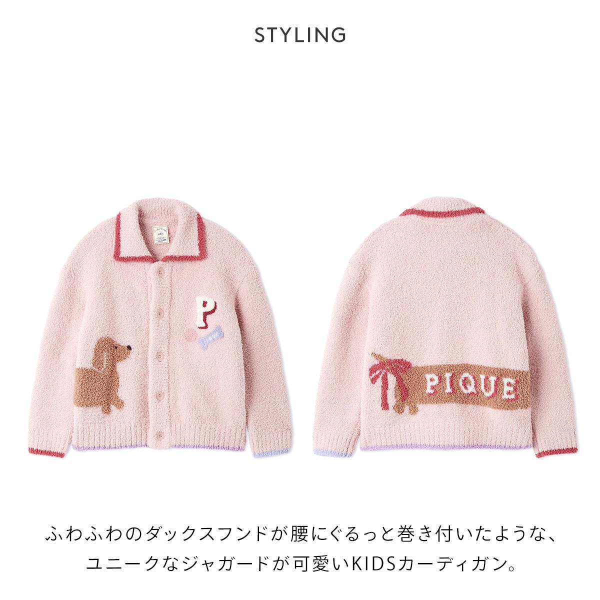 ふわふわのダックスフンドが腰にぐるっと巻き付いたような、ユニークなジャガードが可愛いKIDSカーディガン。トレンド感のある襟付きのシルエットで、首元まで暖かです。