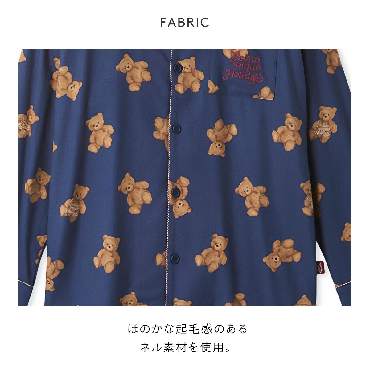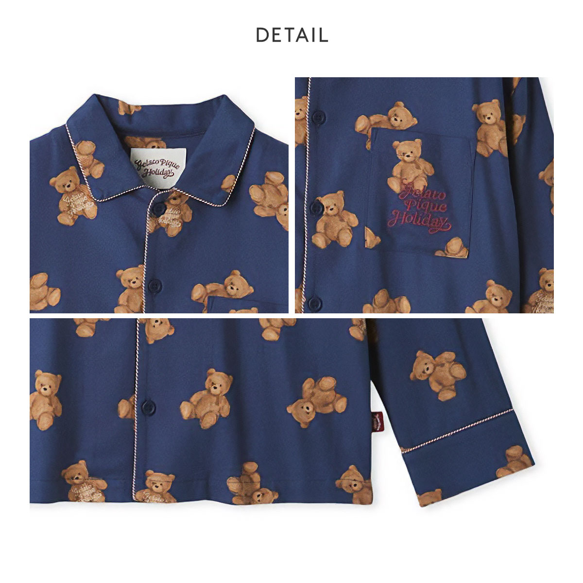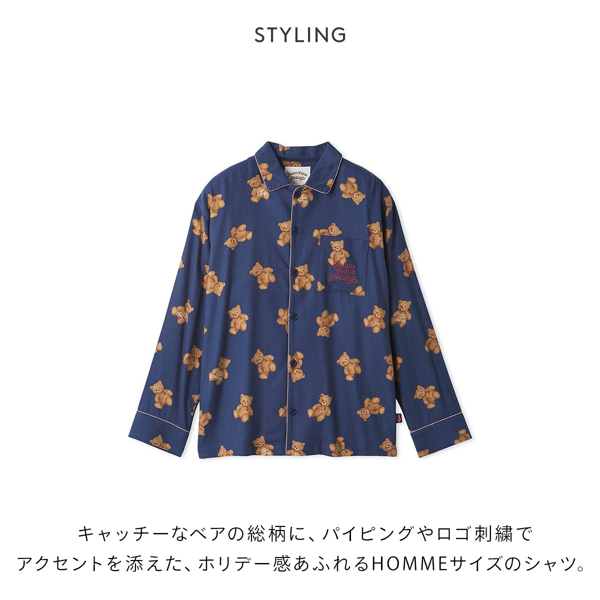 キャッチーなベアの総柄に、キャンディーケインのようなパイピングや胸ポケットのロゴ刺繍でアクセントを添えた、ホリデー感溢れるHOMMEサイズのシャツです。