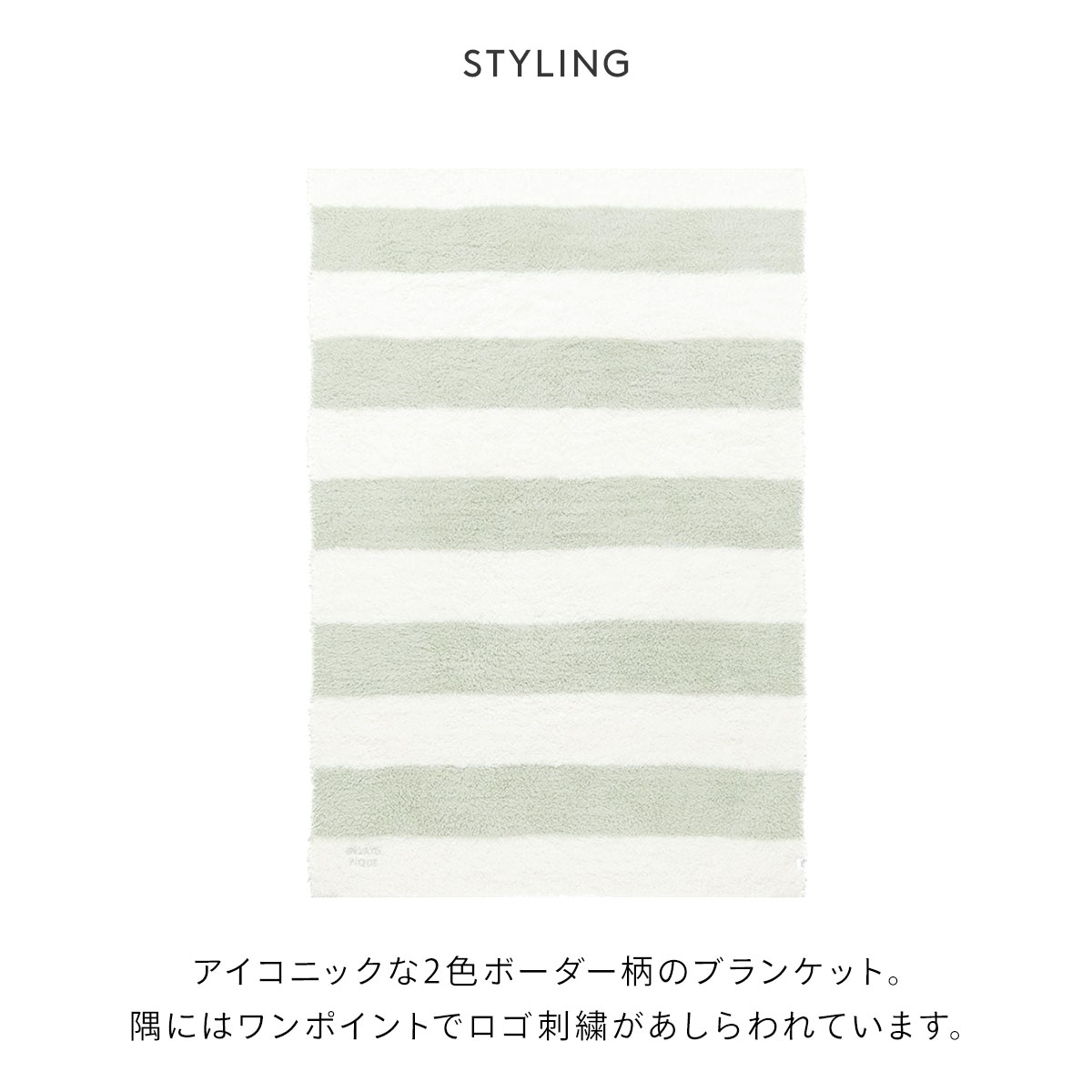 アイコニックな2色ボーダー柄のブランケット。隅にはワンポイントでロゴ刺繍があしらわれています。