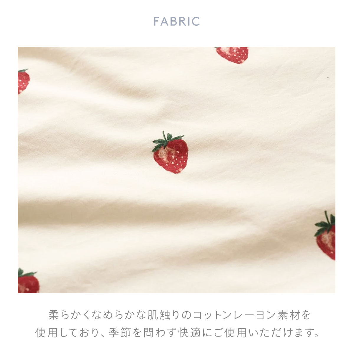 ファブリックは、柔らかくなめらかな肌触りのコットンレーヨン素材を使用しており、季節を問わず快適にご使用いただけます。