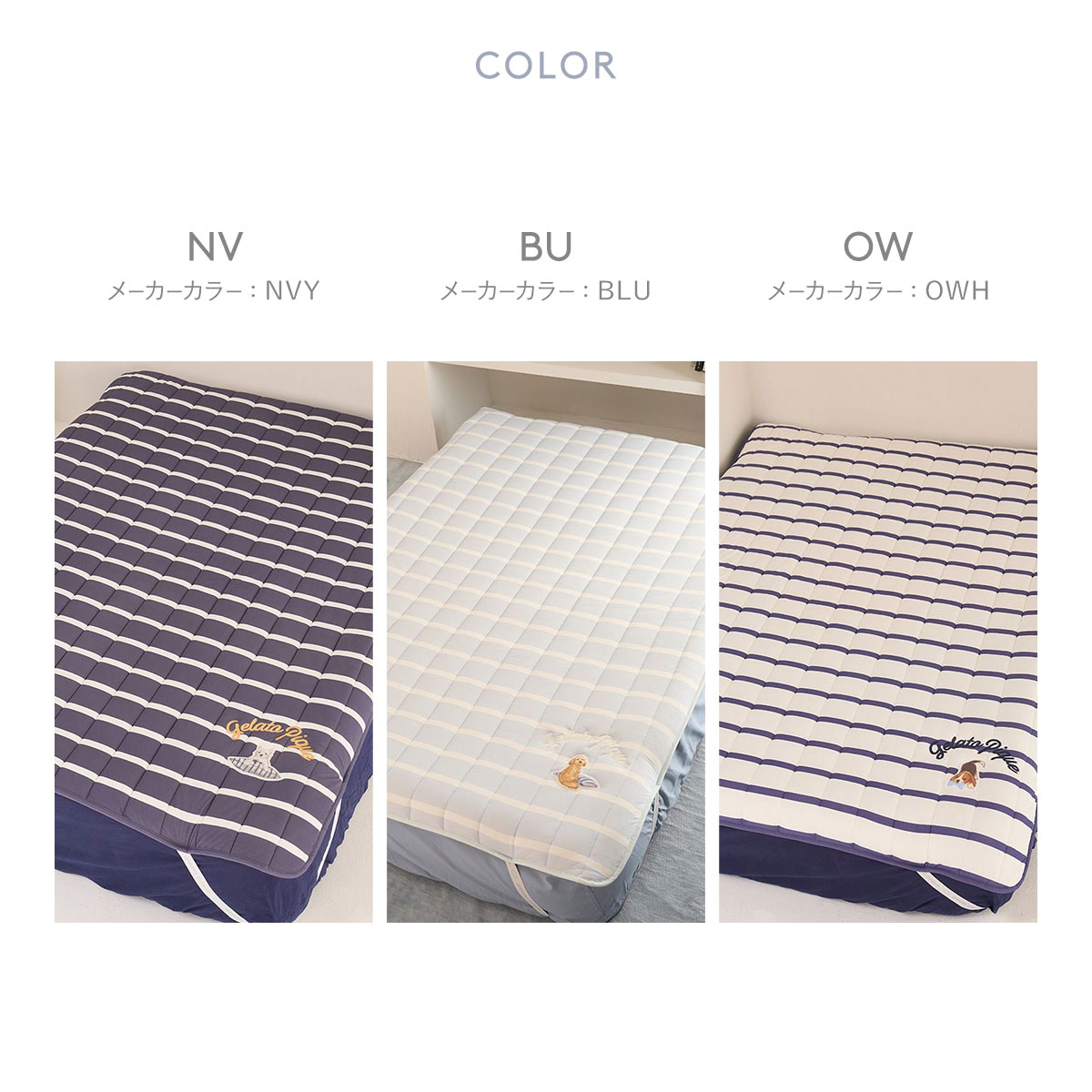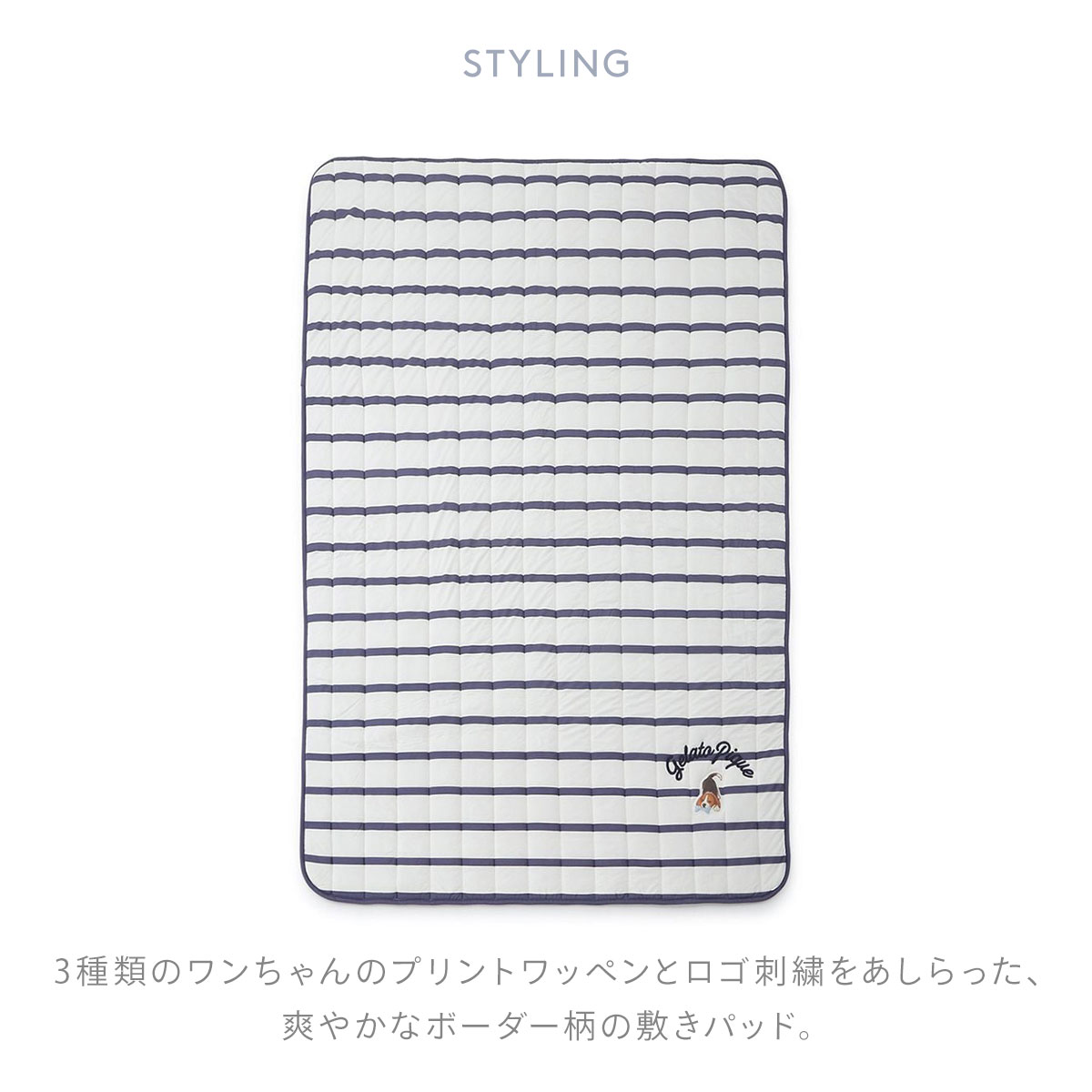 こちらは、3種類のワンちゃんのプリントワッペンとロゴ刺繍をあしらった、爽やかなボーダー柄のセミダブルサイズの敷きパッドです。