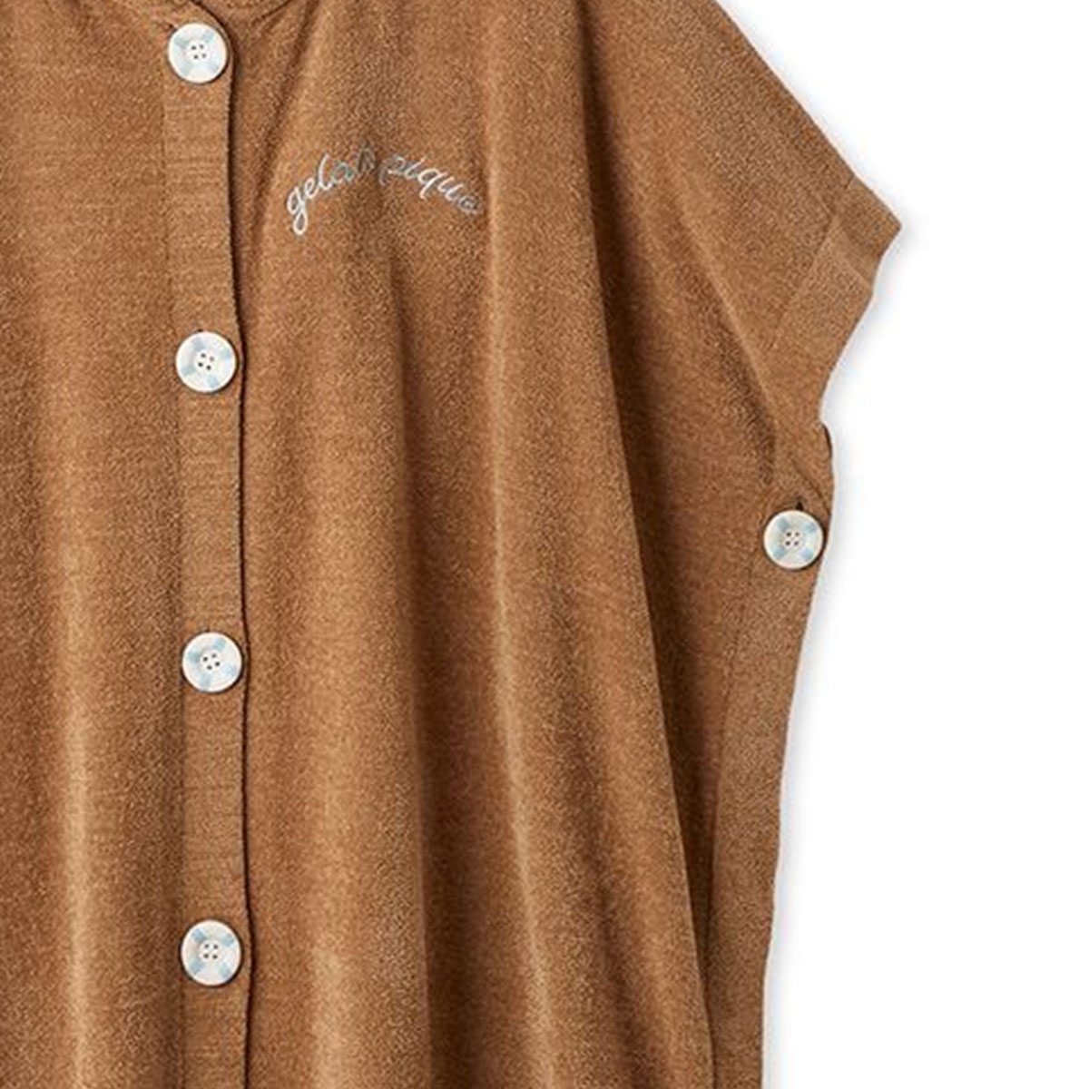 吸水加工を施しているので、お風呂上がりにさらっと羽織ったり、水辺のレジャーシーンにも活躍します。