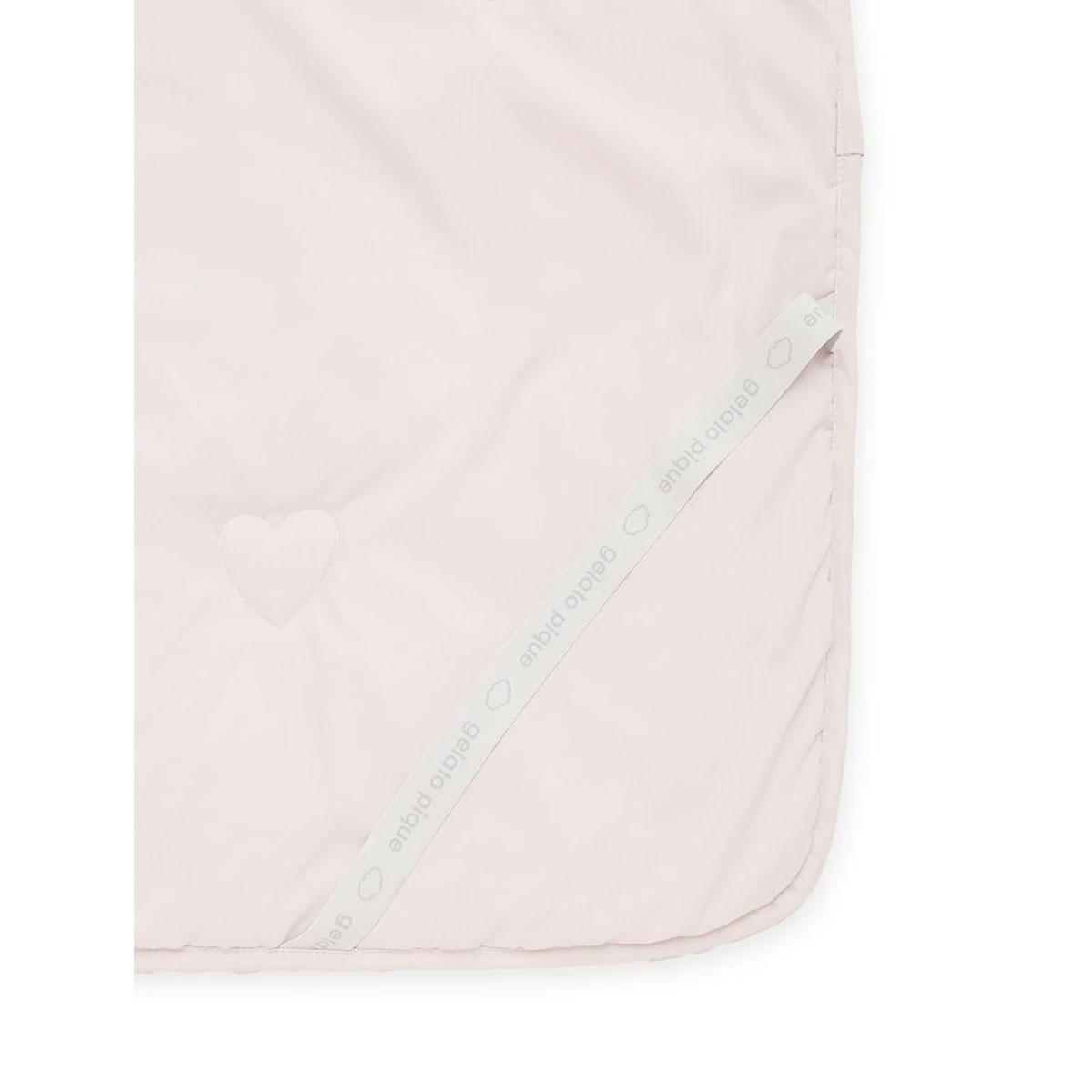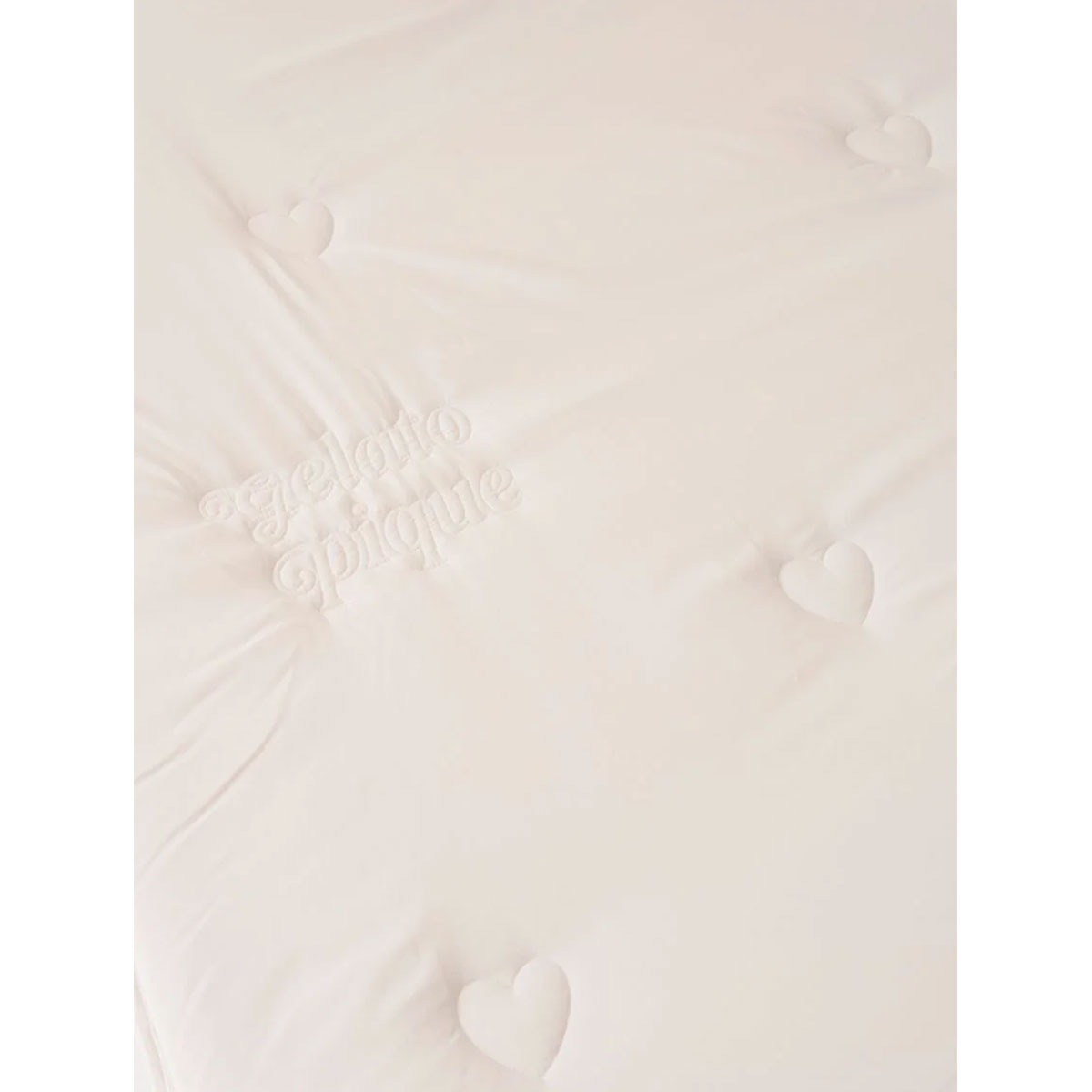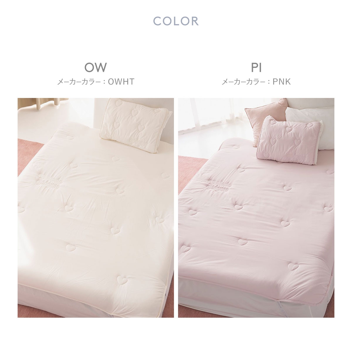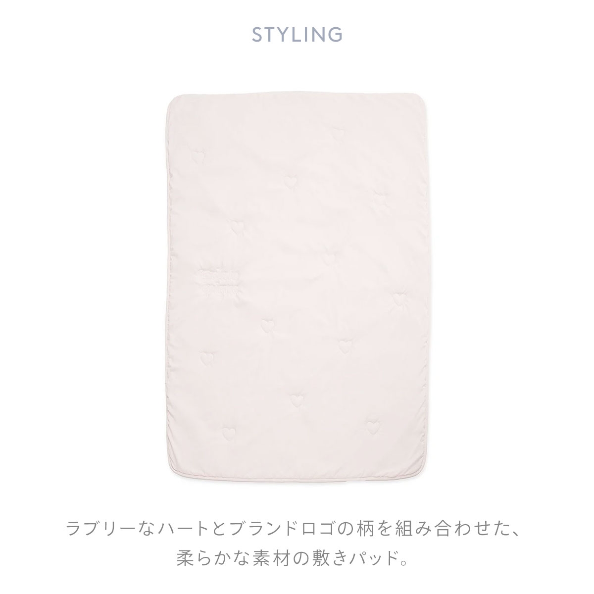 こちらは、ラブリーなハートとブランドロゴの柄を組み合わせた、柔らかなキルト素材の敷パッドです。
