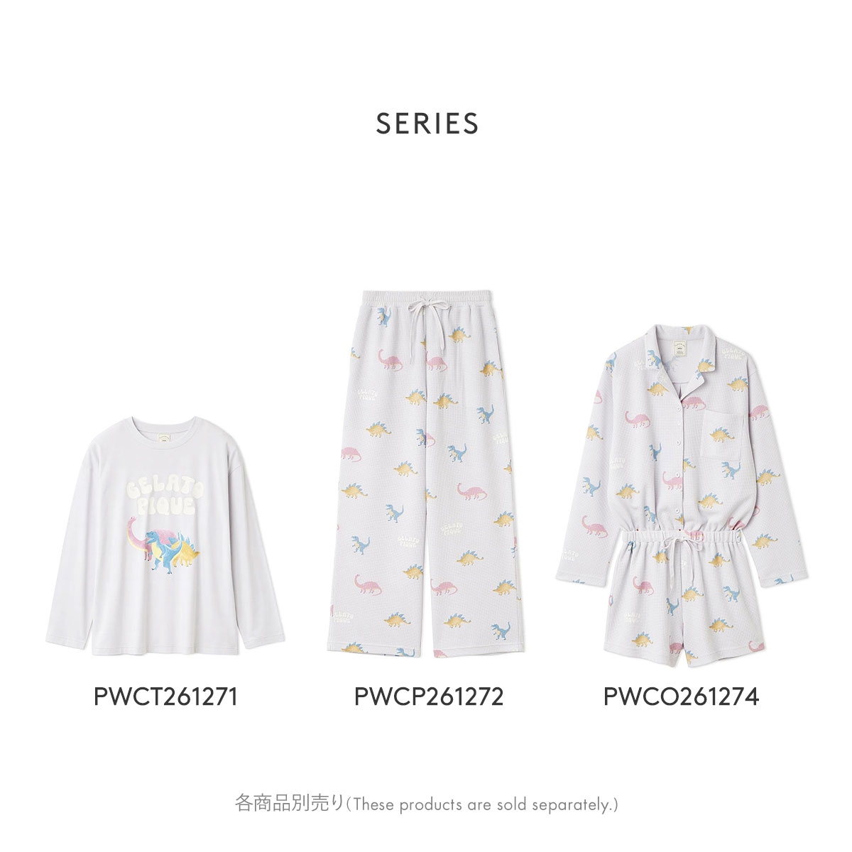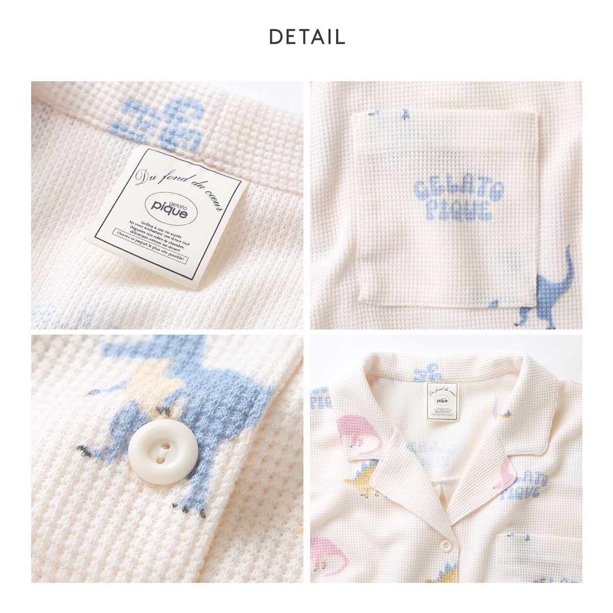 ブルーのティラノサウルス、ピンクのブラキオサウルス、イエローのステゴサウルスに、ブランドロゴを組み合わせたgelato piqueらしいダイナソーの総柄が目を惹きます。