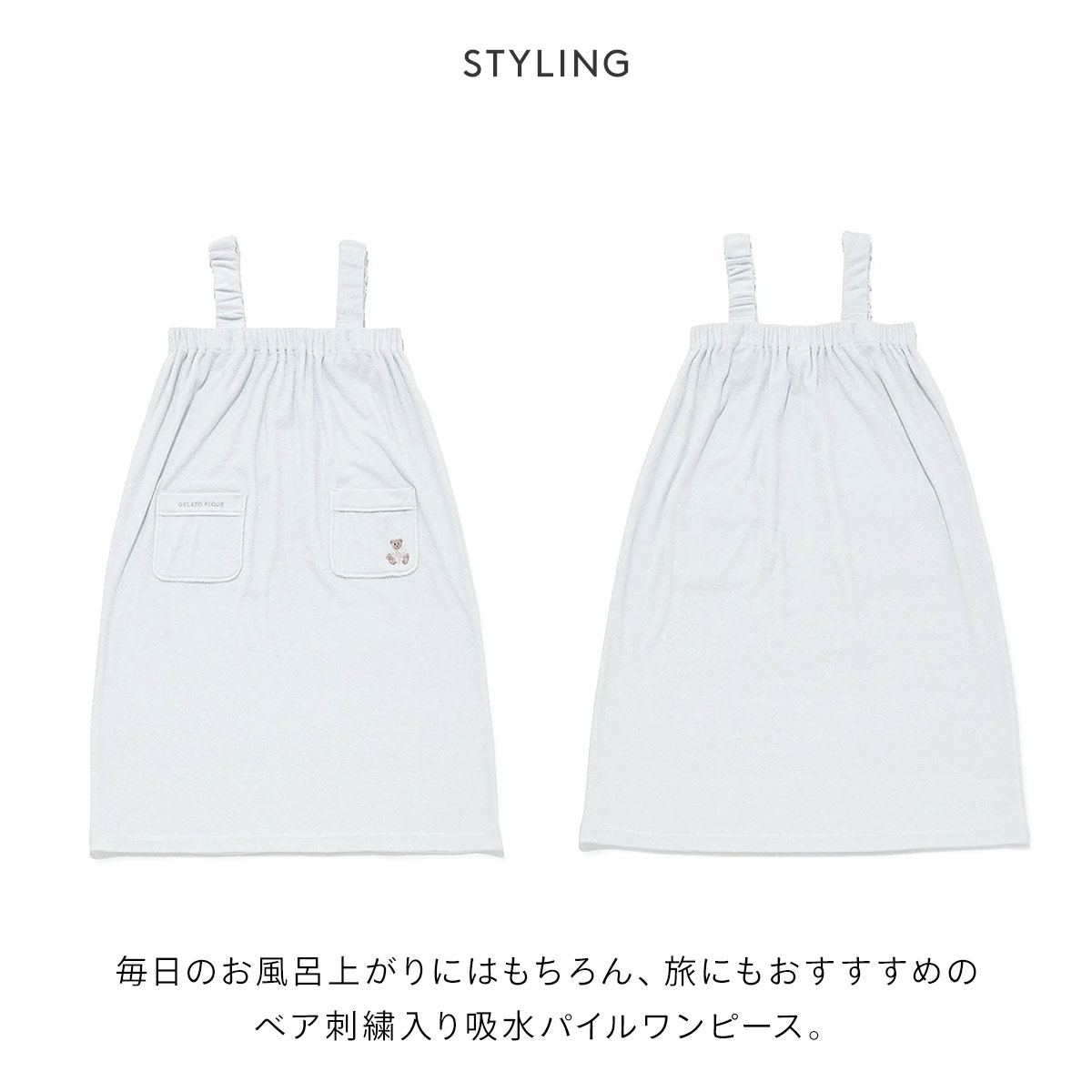 水分を素早く吸収する加工を施した、レーヨンとコットンのパイル素材を使用した、柔らかく、さらっとした着心地をお楽しみいただけるワンピース。