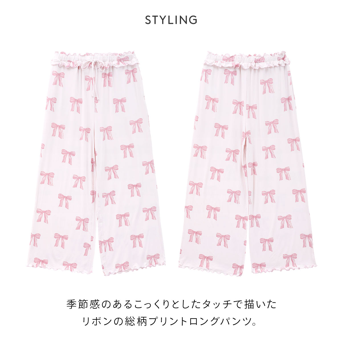 季節感のあるこっくりとしたタッチで描いたリボンを総柄プリントロングパンツ。