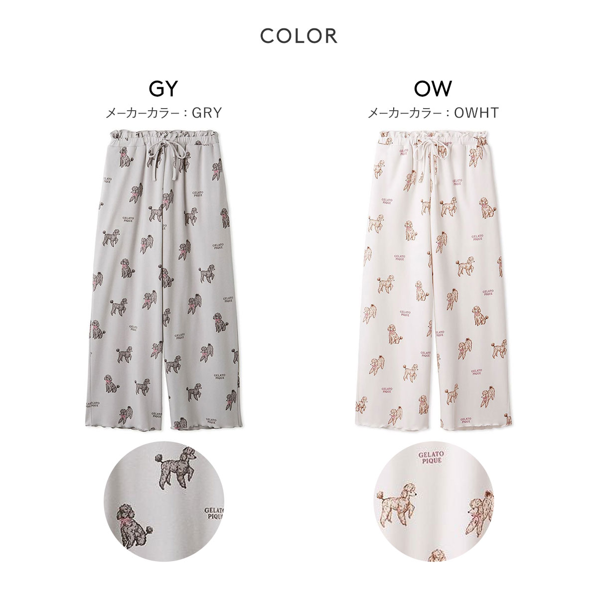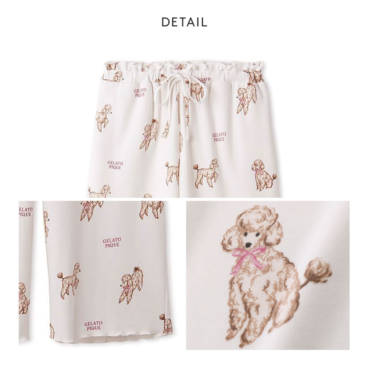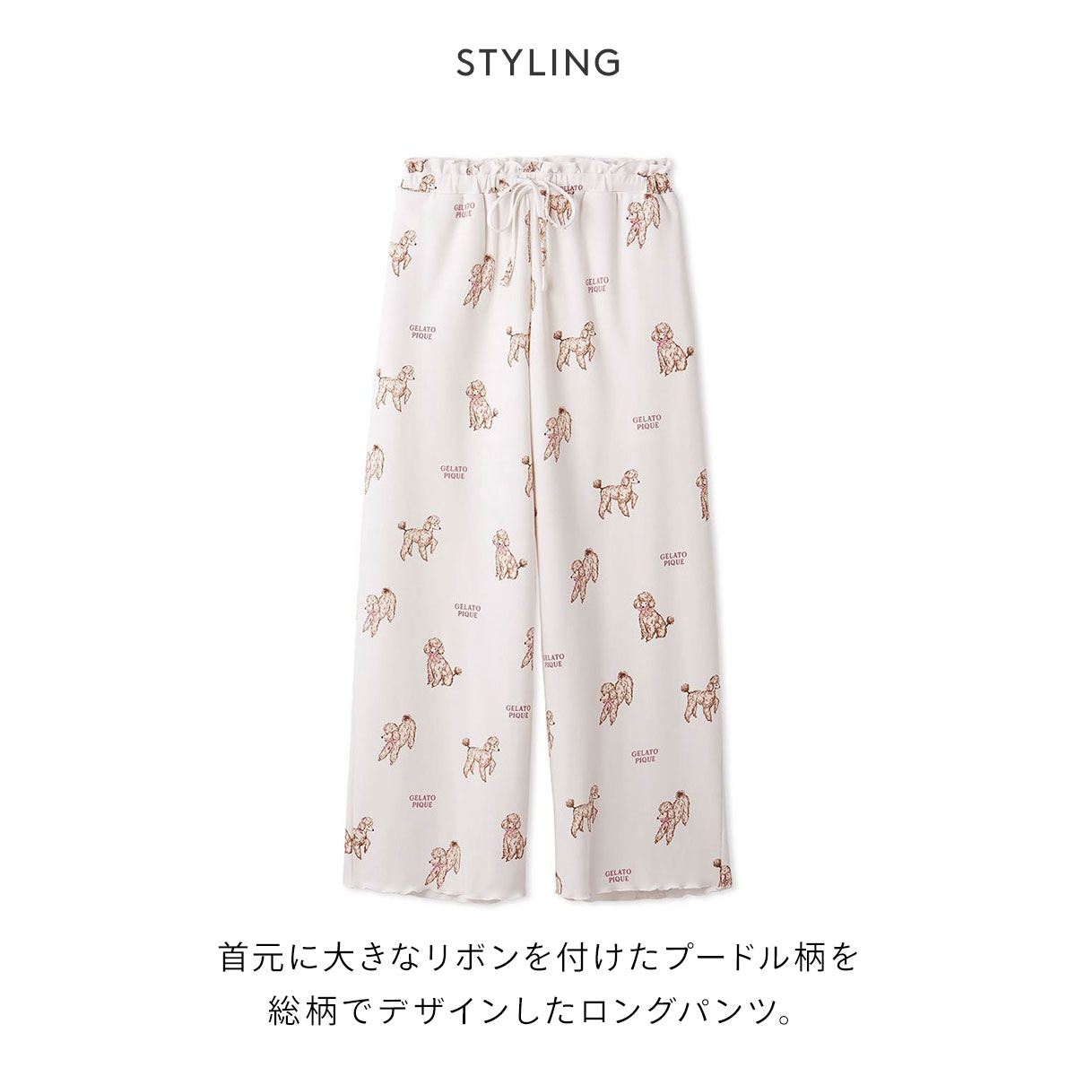 首元に大きなリボンを付けたプードル柄を総柄でデザインしたロングパンツ。