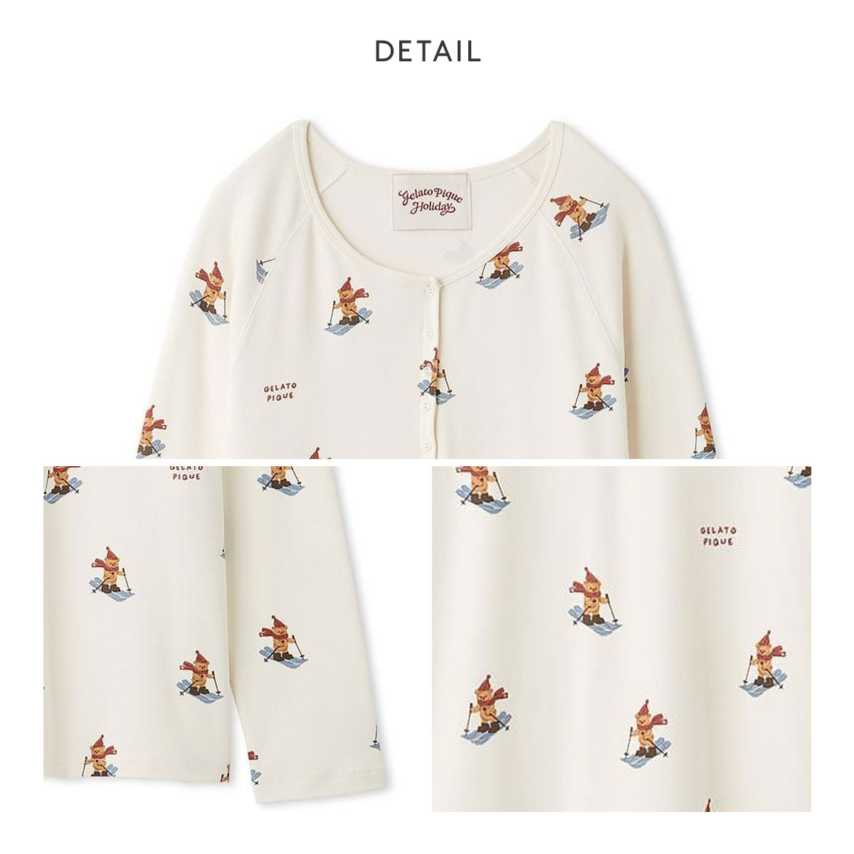 ジェラートピケ レディース HOLIDAY スキーベア柄ロングTシャツ ジェラピケ パジャマ ルームウェア(IV-アイボリー-Free)