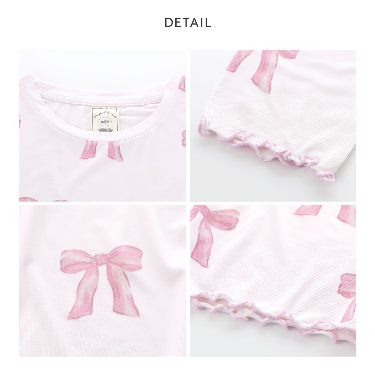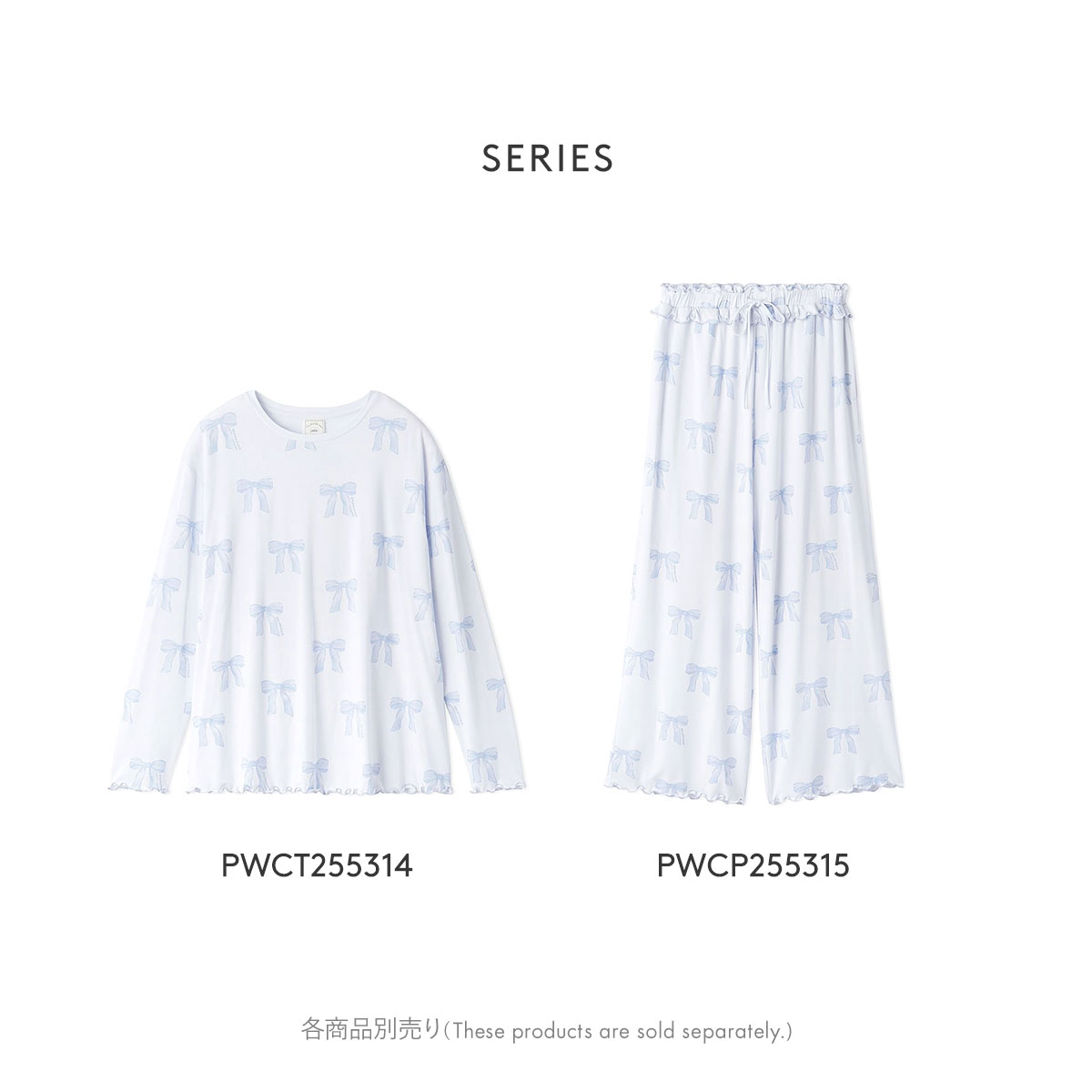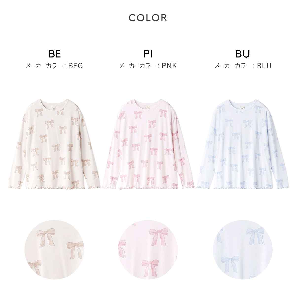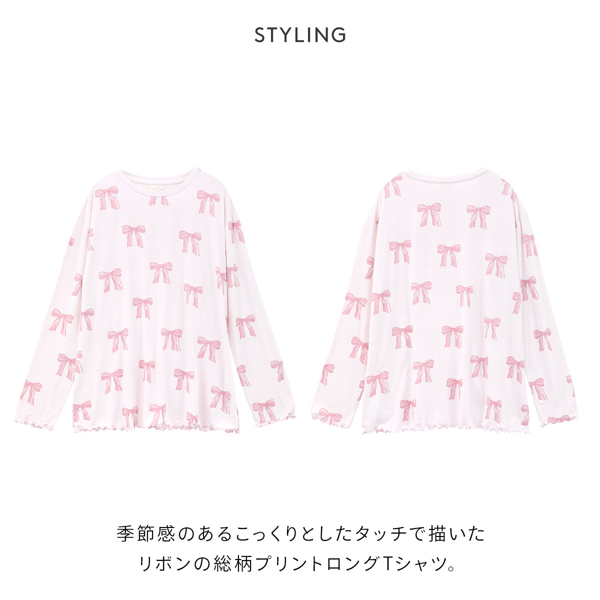 季節感のあるこっくりとしたタッチで描いたリボンの総柄プリントロングTシャツ。