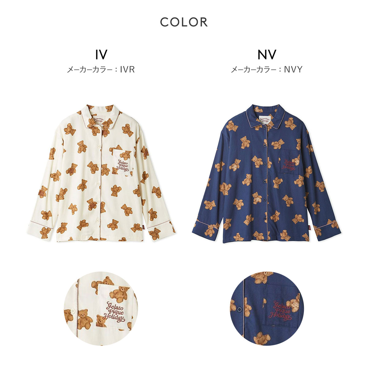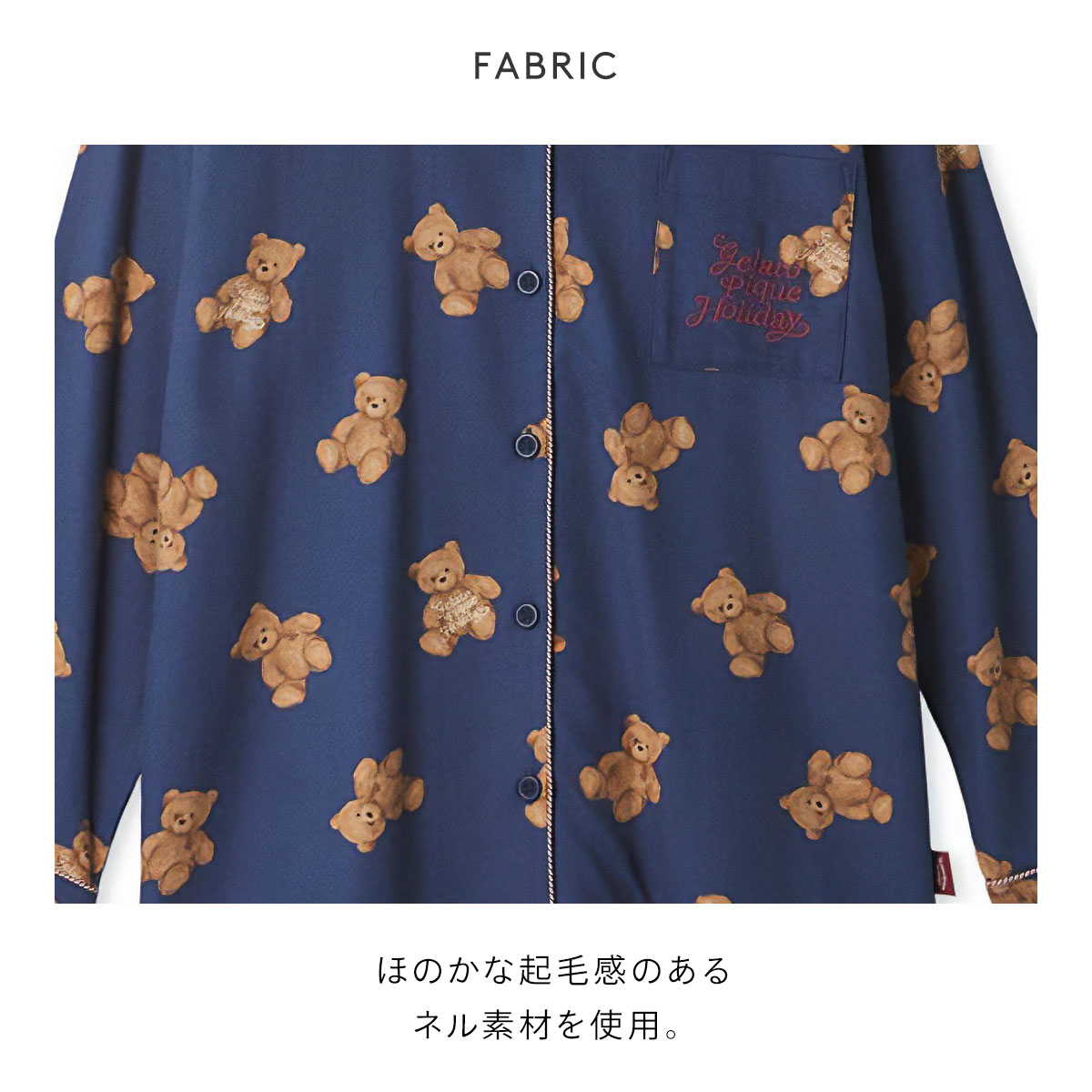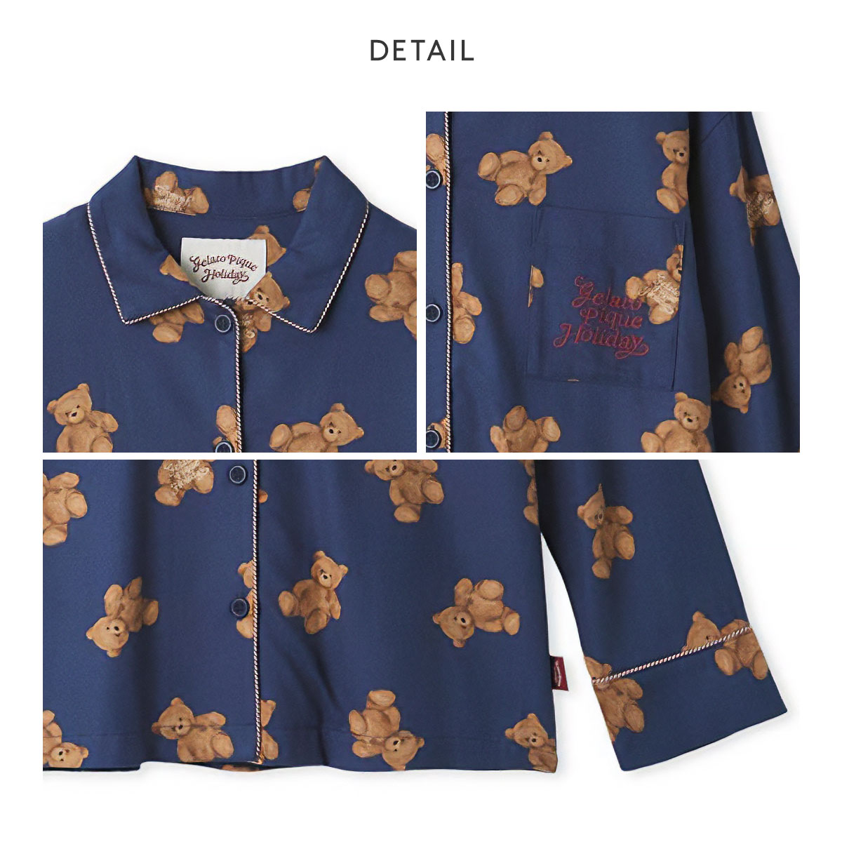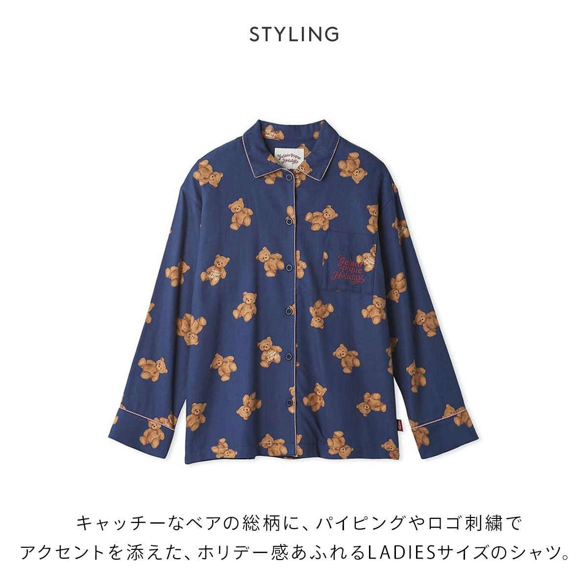 キャッチーなベアの総柄に、キャンディーケインのようなパイピングや胸ポケットのロゴ刺繍でアクセントを添えた、ホリデー感溢れるLADIESサイズのシャツです。