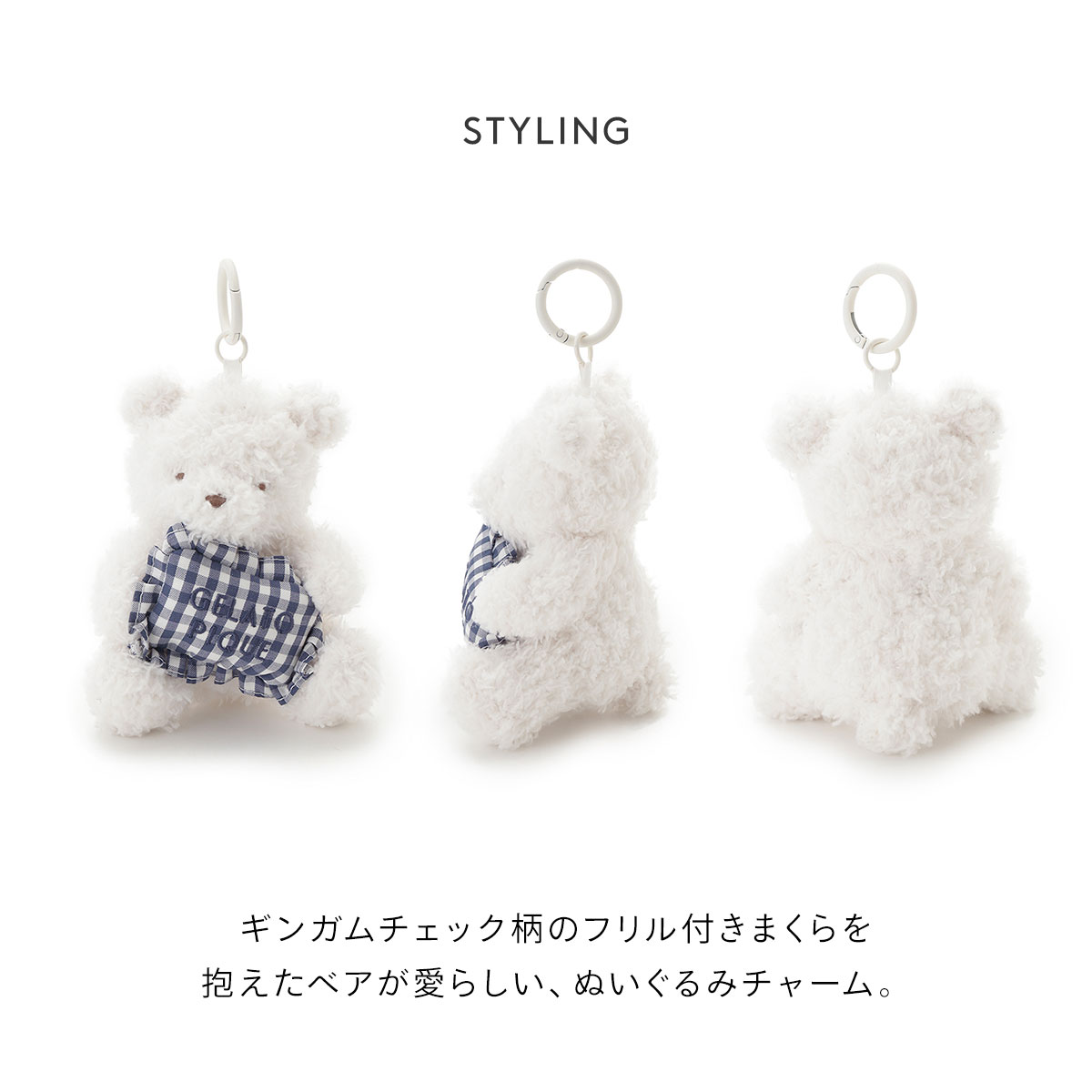 こちらは、ギンガムチェック柄のフリル付きまくらを抱えたベアが愛らしい、ぬいぐるみチャームです。