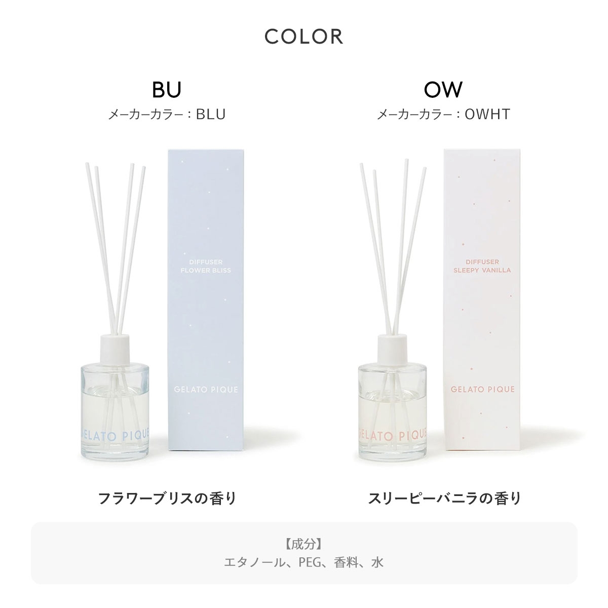 香りは、優しい甘さにふんわり包まれるスリーピーバニラの香りと、爽やかな心地良さが空間に広がるフラワーブリスの2種類。